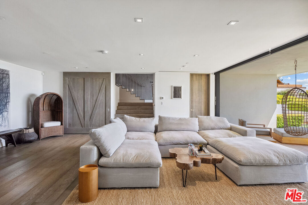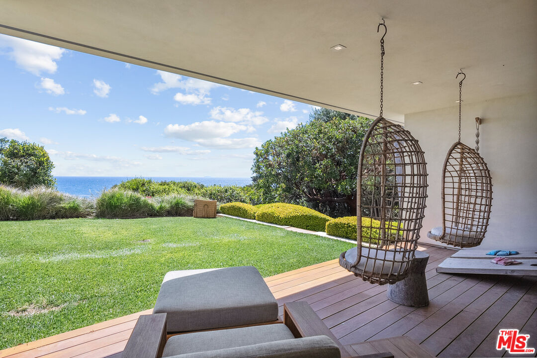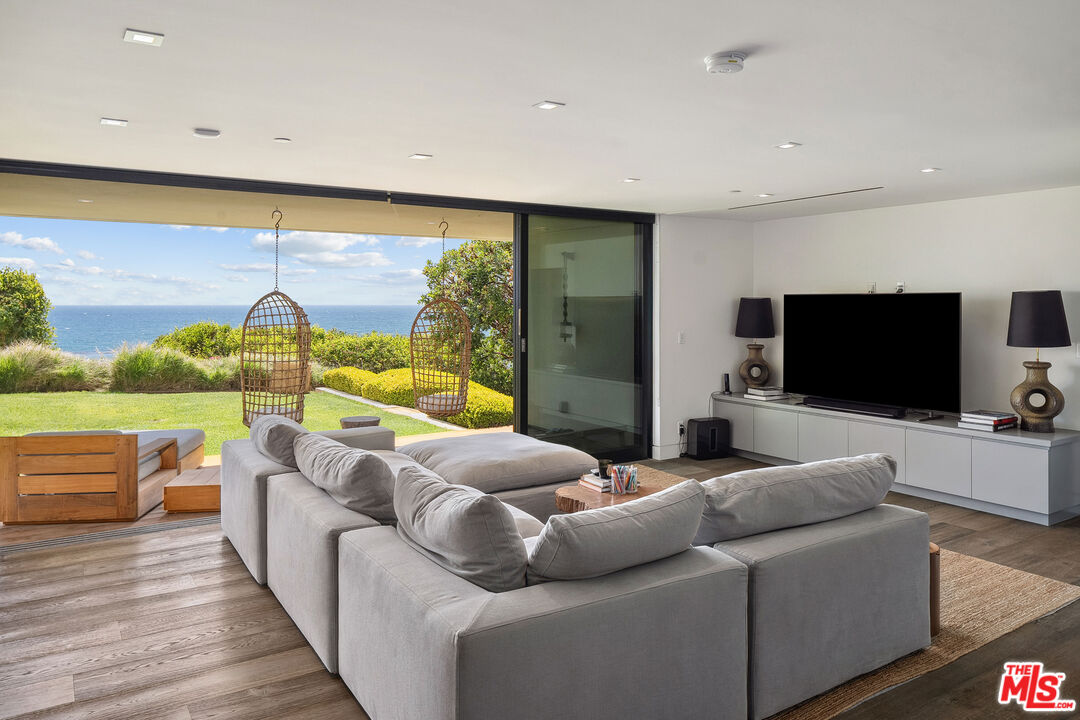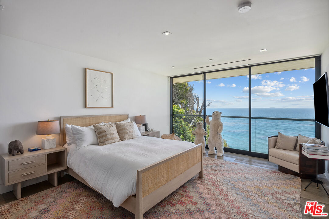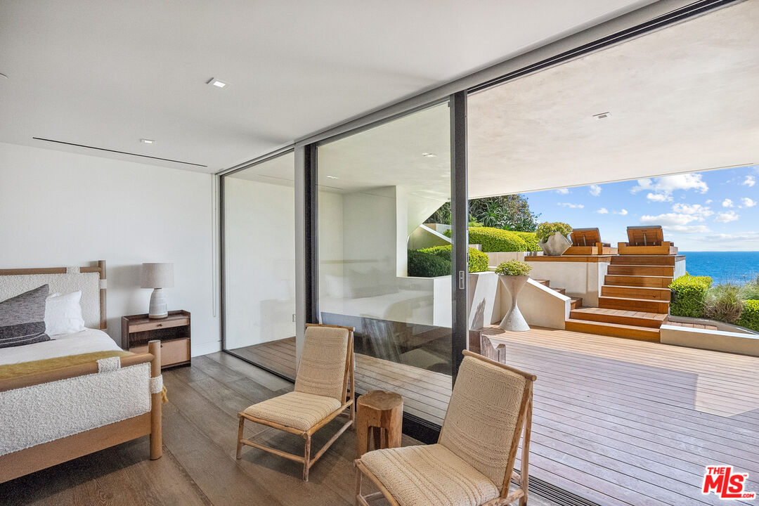 Commanding sweeping ocean vistas from nearly every room, this extraordinary blufftop estate in Malibu blends refined modern living with serene coastal luxury. Conceived by acclaimed architect Doug Burdge and built to exacting standards by Scott Halley, the residence is a fully realized vision of elegance and sophistication enhanced by a rare additional parcel and direct stair access to one of Malibu's most coveted beaches, just past Lechuza Point. Impeccably upgraded with state-of-the-art audio/visual and security systems, the home offers effortless comfort and advanced functionality throughout. The property may also be sold fully furnished, offering a truly turnkey experience. The main level features a spacious step-down living room with fireplace, an open dining area, and a versatile office or music room, all oriented to capture the dramatic ocean views. A huge deck off the living room includes a spa and BBQ, perfect for entertaining or relaxing above the coastline. The gourmet kitchen, equipped with top-tier appliances, opens to a second generous deck with stair access to the lush garden terraces below. Nearly every room on this floor enjoys breathtaking views of the Pacific. A dramatic open staircase leads to the expansive top-floor primary suite, a private retreat with panoramic coastline views, a spa-like bath, and a massive walk-in closet. Two additional large bedroom suites complete the upper level, each offering their own stunning outlooks and luxurious finishes. On the lower level, a sleek media and game lounge is complemented by a Sub-Zero wet bar and a temperature-controlled wine cellar. Two additional guest suites complete this floor, providing comfort and privacy for family or visitors. The outdoor spaces are designed for both relaxation and connection to nature, with beautifully landscaped gardens, multiple lounging and dining areas, and an outdoor shower, ideal after a day on the sand. A rare opportunity to own a turnkey bluff estate in one of Malibu's most desirable settings.