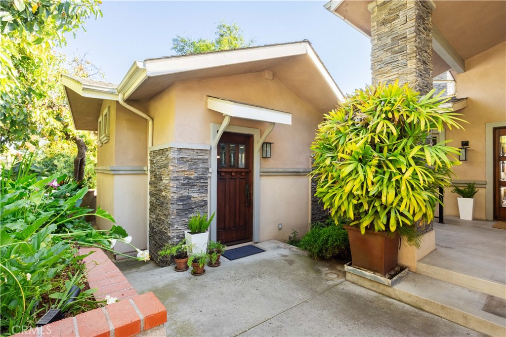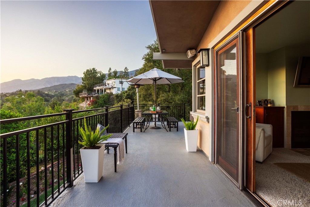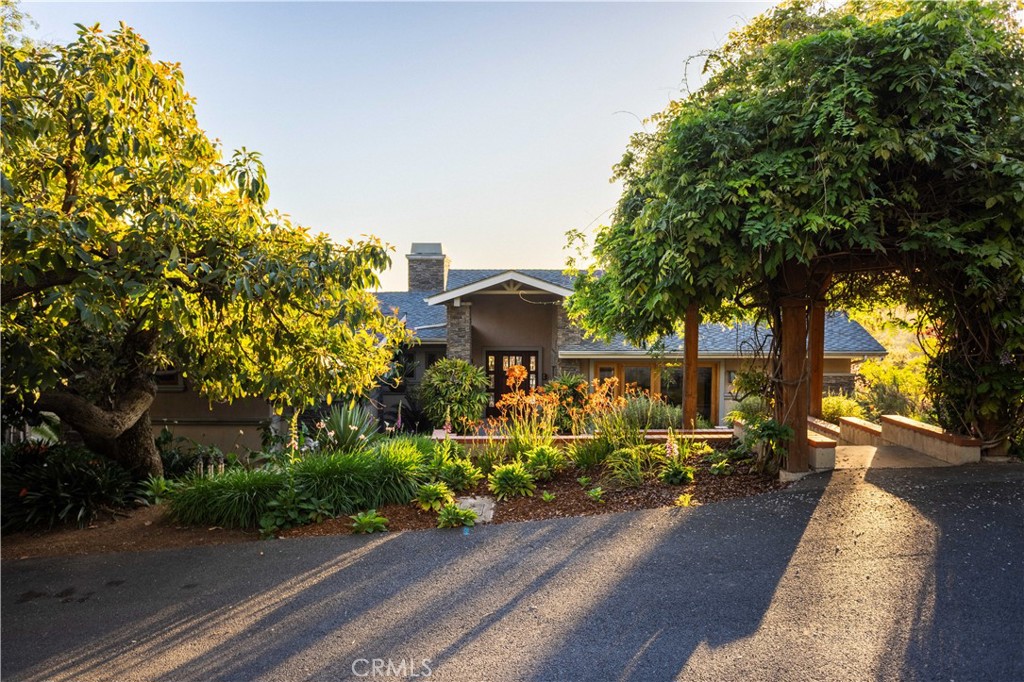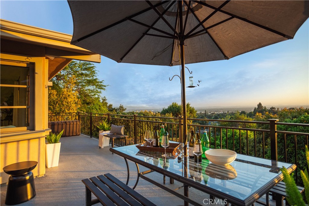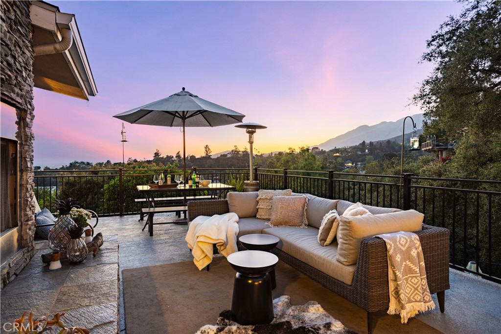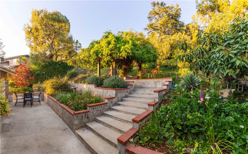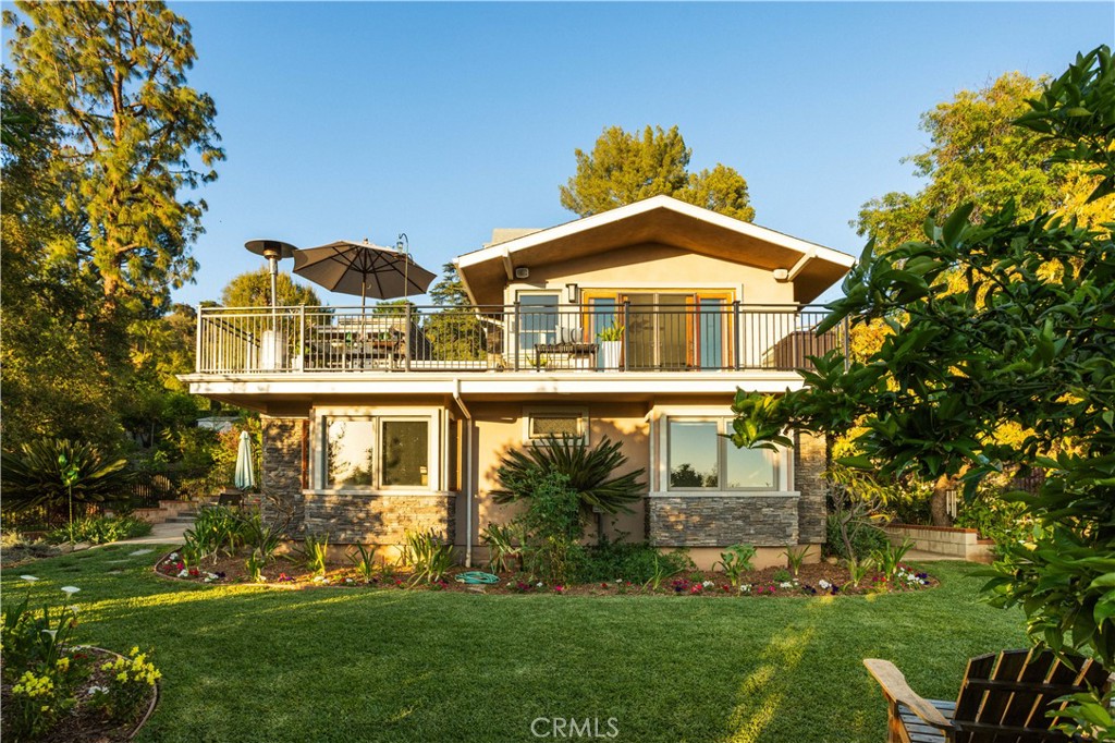 Nestled in a north Monrovia enclave this impressive residence commands breathtaking 180-degree panoramas stretching from the vibrant cityscape of downtown Los Angeles to the serene silhouette of Catalina Island on the horizon. A picturesque wisteria-draped trellis welcomes you as you gracefully descend the steps to the inviting front entrance. The main level unfolds into a generously proportioned living room, elegantly appointed with a warm fireplace framed by custom shelving and seamless access to the expansive deck – an ideal spot for al fresco relaxation and soaking in the stunning vistas. Entertain with sophistication in the formal dining room, which conveniently connects to a meticulously climate-controlled 900-bottle wine cellar, perfect for the discerning enthusiast. The expansive kitchen is a culinary masterpiece, anchored by a substantial center island and boasting professional-grade stainless steel appliances, a casual breakfast bar, and a sun-drenched breakfast nook, all while framing captivating views. Tucked away for ultimate tranquility, the primary bedroom is a private retreat featuring its own fireplace, a spacious walk-in closet, and a luxurious en-suite bathroom complete with dual sink vanities, an oversize tub, and a separate shower. Direct access to the deck further enhances this serene sanctuary. A versatile office space (easily convertible to a 4th bedroom), a full bathroom, a powder room, and a well-equipped laundry room with ample cabinetry complete the thoughtfully designed main level. The lower level provides additional living space with two well-sized bedrooms, a shared bathroom, a comfortable family room, and a dedicated office – offering flexibility for family living or guest accommodations. Step outside into a flourishing garden, a true urban oasis brimming with vibrant kale, healthy broccoli, fragrant citrus, and delectable avocado trees – a testament to nature's bounty. Adding to the property's appeal is a charming detached guest house, a proven successful Airbnb, offering a spacious room and a private bathroom. Completing this exceptional property are a detached two-car garage with an attached storage room and a driveway providing ample off-street parking. This is more than a home; it's a lifestyle, offering unparalleled views, luxurious amenities, and a connection to nature, all within easy reach of city conveniences.