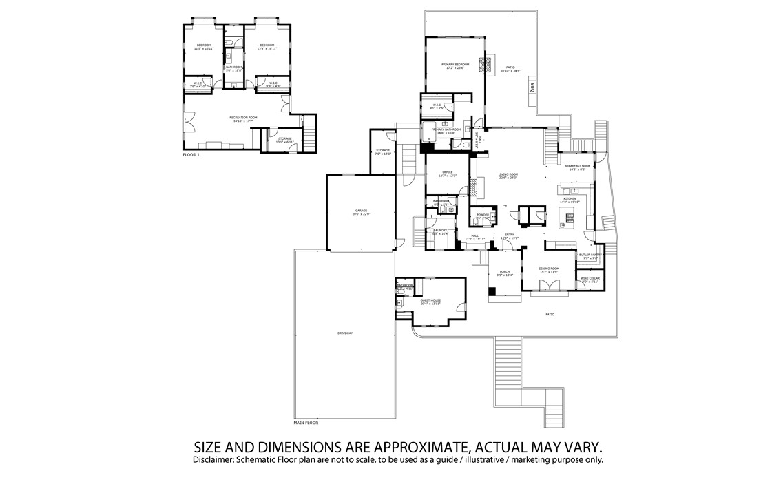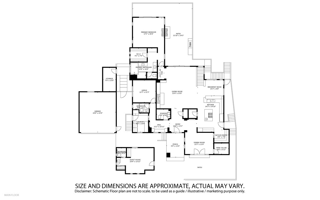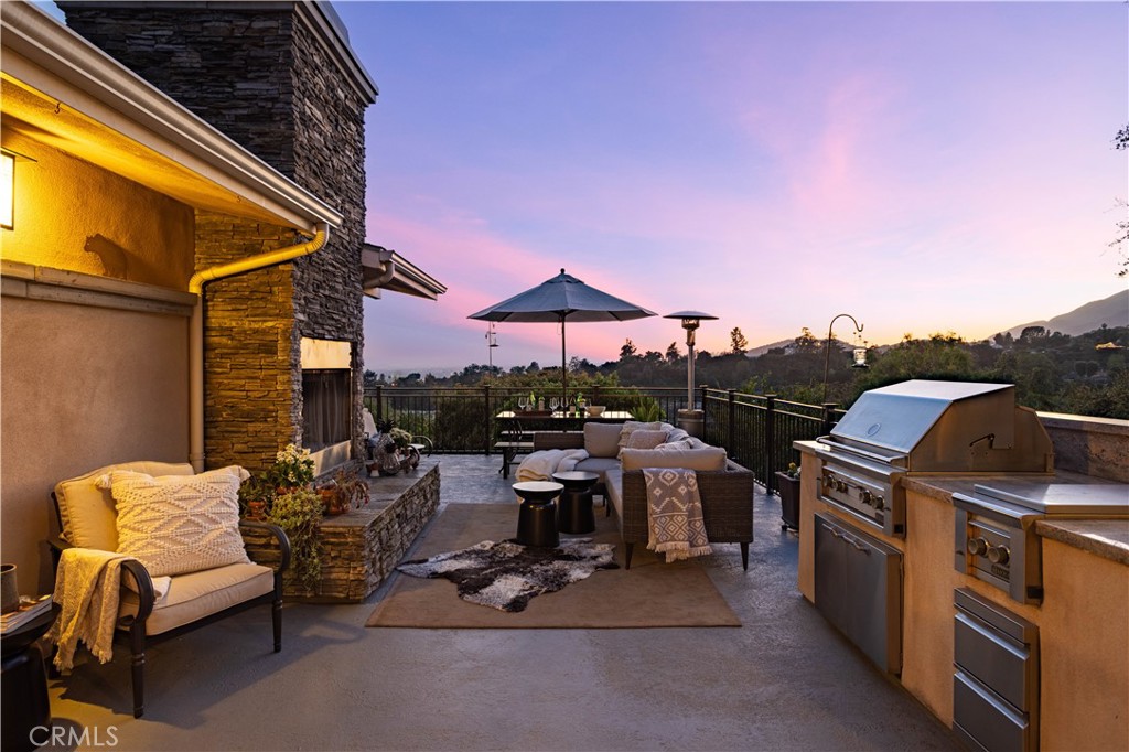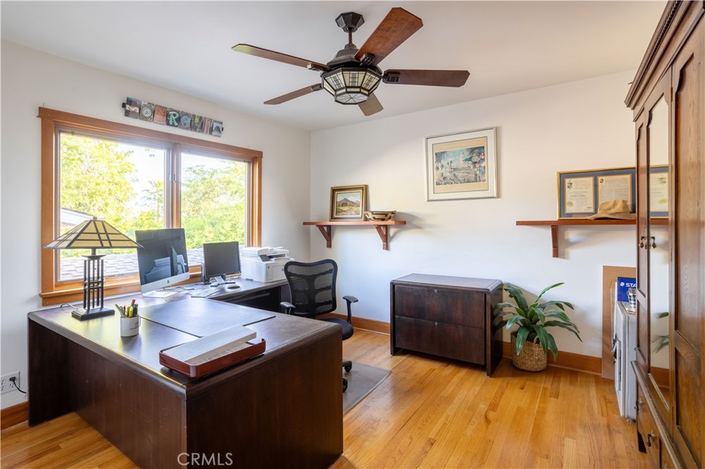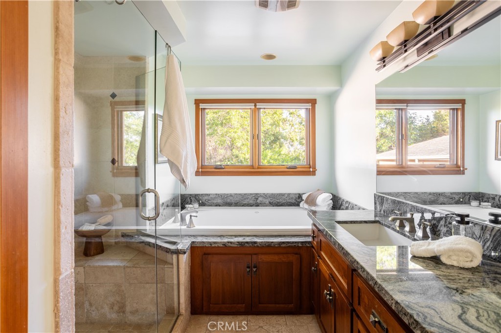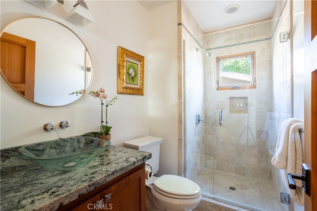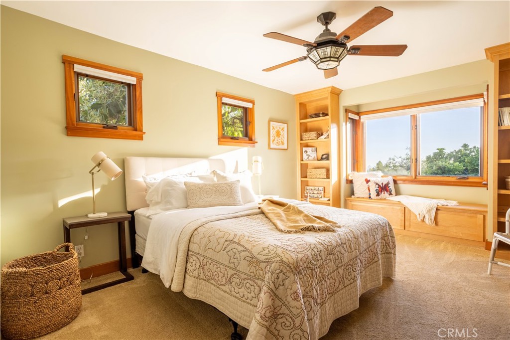 Nestled in a north Monrovia enclave this impressive residence commands breathtaking 180-degree panoramas stretching from the vibrant cityscape of downtown Los Angeles to the serene silhouette of Catalina Island on the horizon. A picturesque wisteria-draped trellis welcomes you as you gracefully descend the steps to the inviting front entrance. The main level unfolds into a generously proportioned living room, elegantly appointed with a warm fireplace framed by custom shelving and seamless access to the expansive deck – an ideal spot for al fresco relaxation and soaking in the stunning vistas. Entertain with sophistication in the formal dining room, which conveniently connects to a meticulously climate-controlled 900-bottle wine cellar, perfect for the discerning enthusiast. The expansive kitchen is a culinary masterpiece, anchored by a substantial center island and boasting professional-grade stainless steel appliances, a casual breakfast bar, and a sun-drenched breakfast nook, all while framing captivating views. Tucked away for ultimate tranquility, the primary bedroom is a private retreat featuring its own fireplace, a spacious walk-in closet, and a luxurious en-suite bathroom complete with dual sink vanities, an oversize tub, and a separate shower. Direct access to the deck further enhances this serene sanctuary. A versatile office space (easily convertible to a 4th bedroom), a full bathroom, a powder room, and a well-equipped laundry room with ample cabinetry complete the thoughtfully designed main level. The lower level provides additional living space with two well-sized bedrooms, a shared bathroom, a comfortable family room, and a dedicated office – offering flexibility for family living or guest accommodations. Step outside into a flourishing garden, a true urban oasis brimming with vibrant kale, healthy broccoli, fragrant citrus, and delectable avocado trees – a testament to nature's bounty. Adding to the property's appeal is a charming detached guest house, a proven successful Airbnb, offering a spacious room and a private bathroom. Completing this exceptional property are a detached two-car garage with an attached storage room and a driveway providing ample off-street parking. This is more than a home; it's a lifestyle, offering unparalleled views, luxurious amenities, and a connection to nature, all within easy reach of city conveniences.