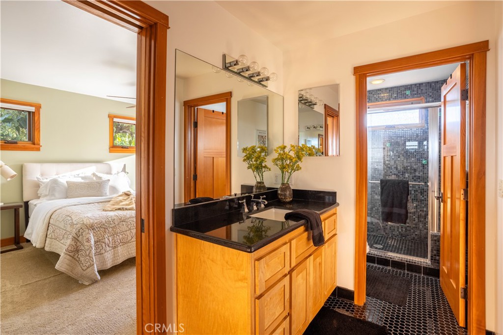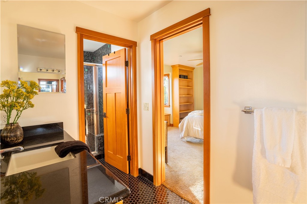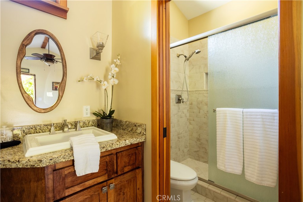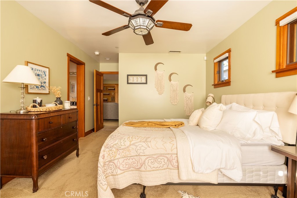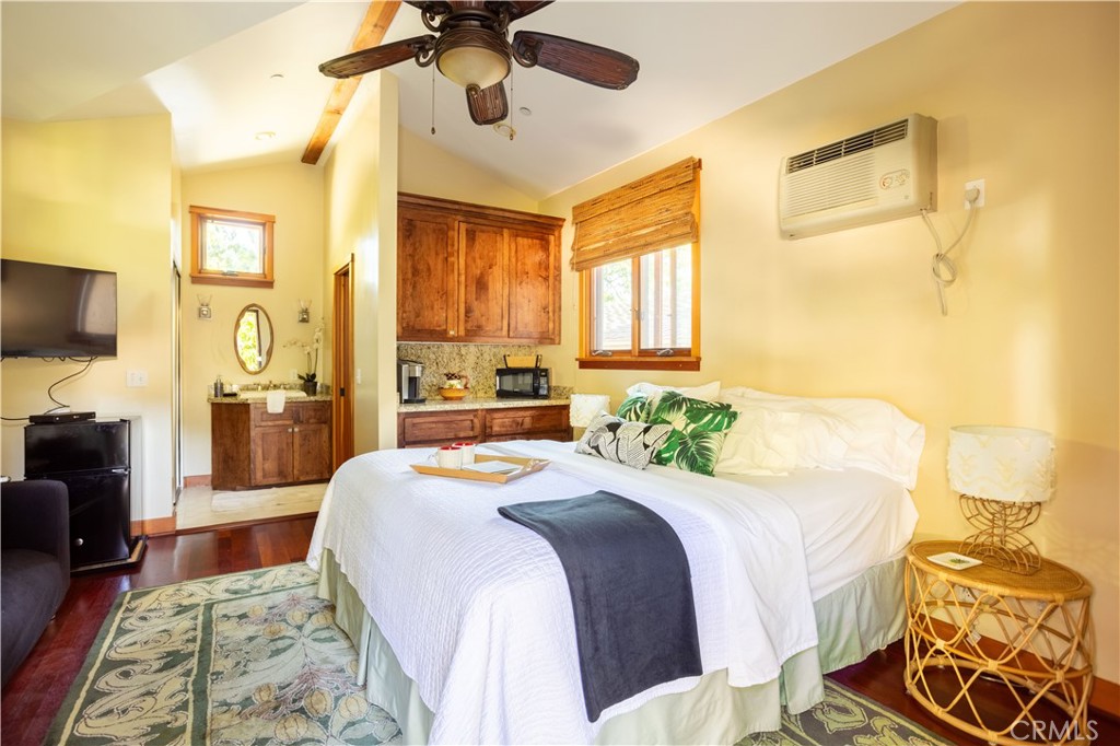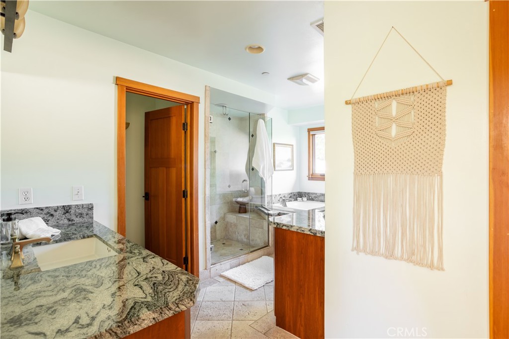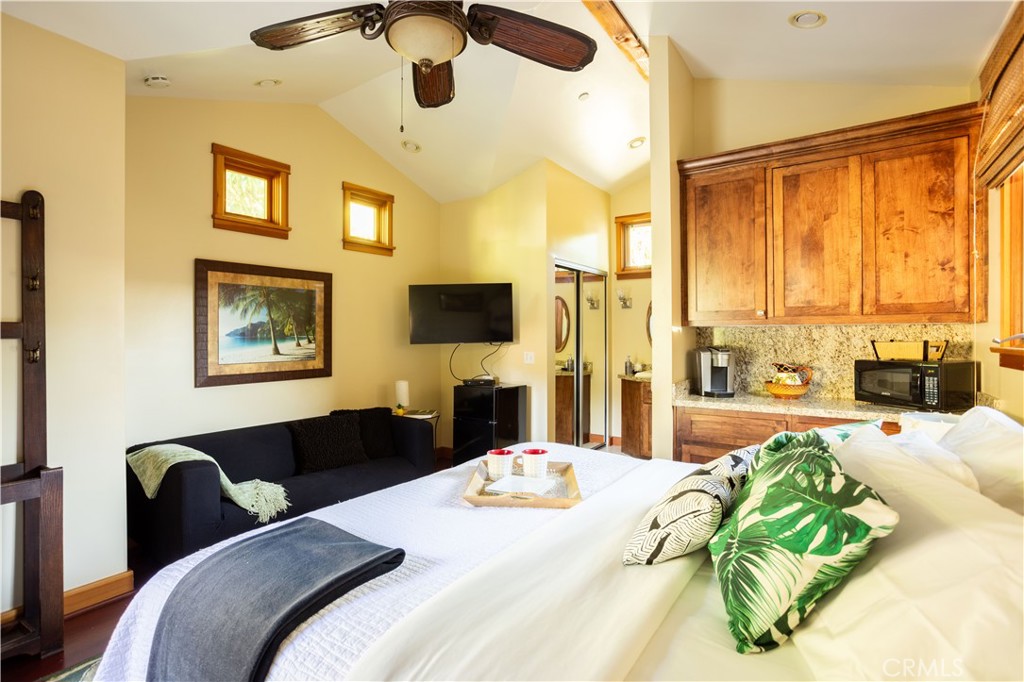 Nestled in a north Monrovia enclave this impressive residence commands breathtaking 180-degree panoramas stretching from the vibrant cityscape of downtown Los Angeles to the serene silhouette of Catalina Island on the horizon. A picturesque wisteria-draped trellis welcomes you as you gracefully descend the steps to the inviting front entrance. The main level unfolds into a generously proportioned living room, elegantly appointed with a warm fireplace framed by custom shelving and seamless access to the expansive deck – an ideal spot for al fresco relaxation and soaking in the stunning vistas. Entertain with sophistication in the formal dining room, which conveniently connects to a meticulously climate-controlled 900-bottle wine cellar, perfect for the discerning enthusiast. The expansive kitchen is a culinary masterpiece, anchored by a substantial center island and boasting professional-grade stainless steel appliances, a casual breakfast bar, and a sun-drenched breakfast nook, all while framing captivating views. Tucked away for ultimate tranquility, the primary bedroom is a private retreat featuring its own fireplace, a spacious walk-in closet, and a luxurious en-suite bathroom complete with dual sink vanities, an oversize tub, and a separate shower. Direct access to the deck further enhances this serene sanctuary. A versatile office space (easily convertible to a 4th bedroom), a full bathroom, a powder room, and a well-equipped laundry room with ample cabinetry complete the thoughtfully designed main level. The lower level provides additional living space with two well-sized bedrooms, a shared bathroom, a comfortable family room, and a dedicated office – offering flexibility for family living or guest accommodations. Step outside into a flourishing garden, a true urban oasis brimming with vibrant kale, healthy broccoli, fragrant citrus, and delectable avocado trees – a testament to nature's bounty. Adding to the property's appeal is a charming detached guest house, a proven successful Airbnb, offering a spacious room and a private bathroom. Completing this exceptional property are a detached two-car garage with an attached storage room and a driveway providing ample off-street parking. This is more than a home; it's a lifestyle, offering unparalleled views, luxurious amenities, and a connection to nature, all within easy reach of city conveniences.