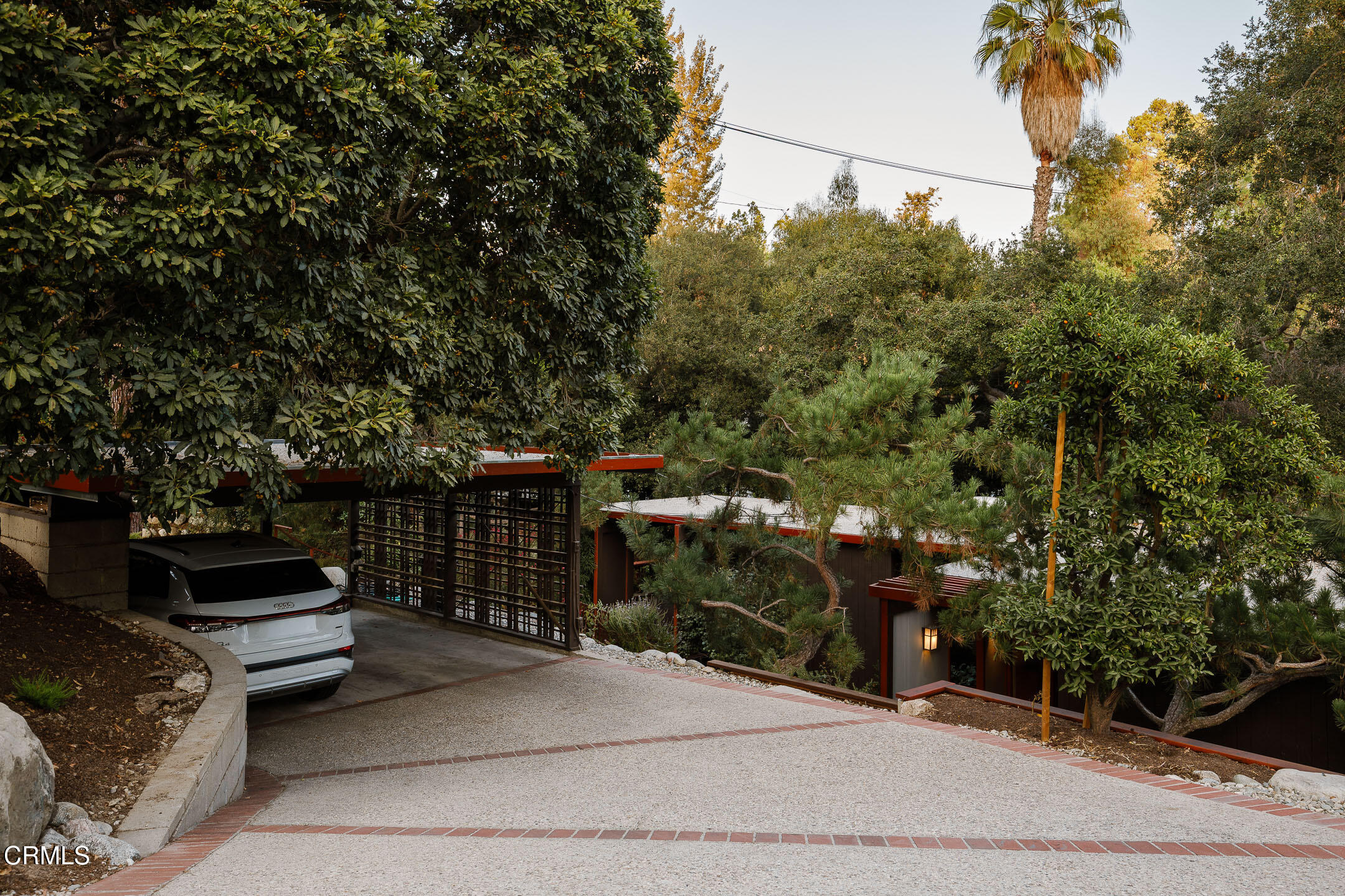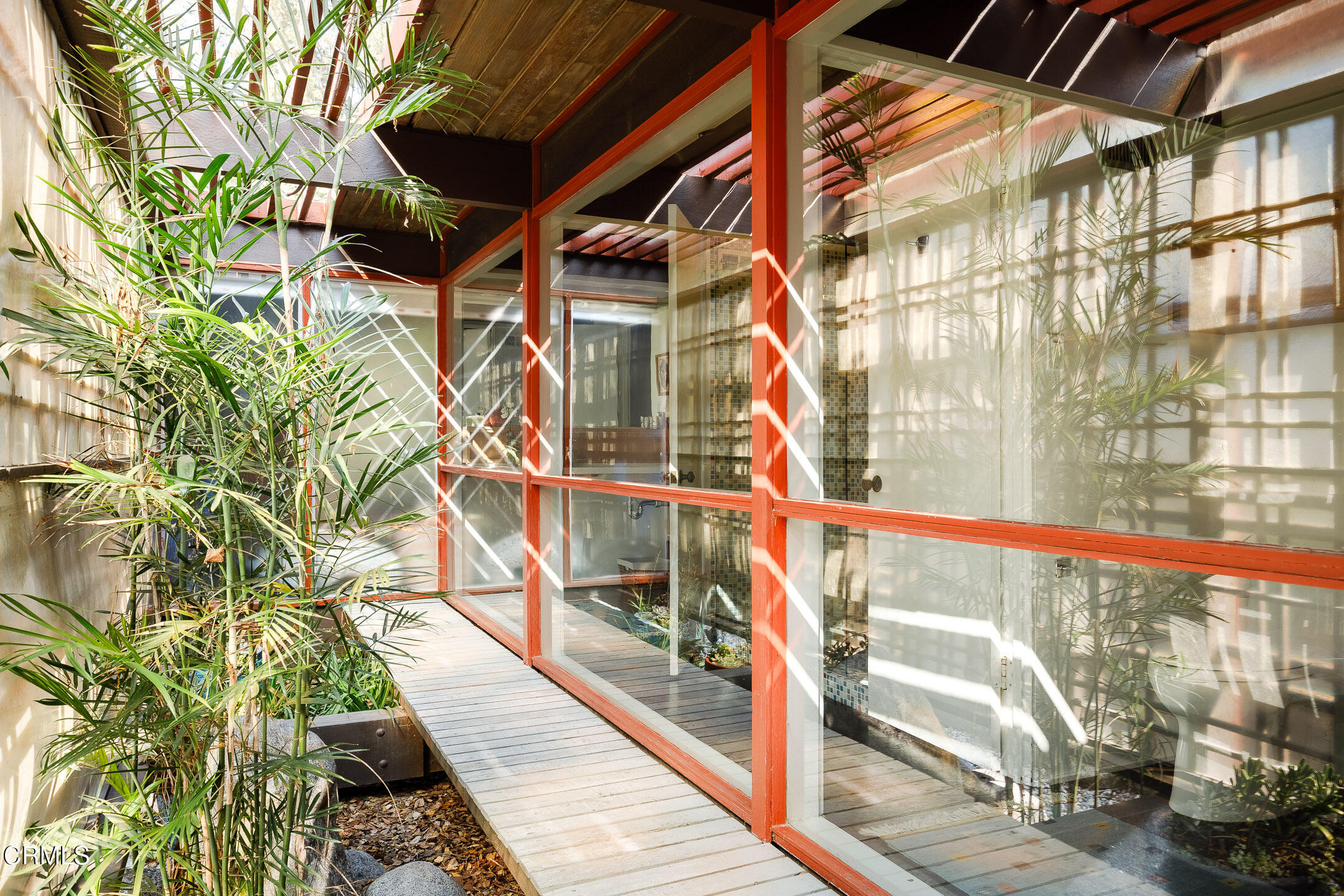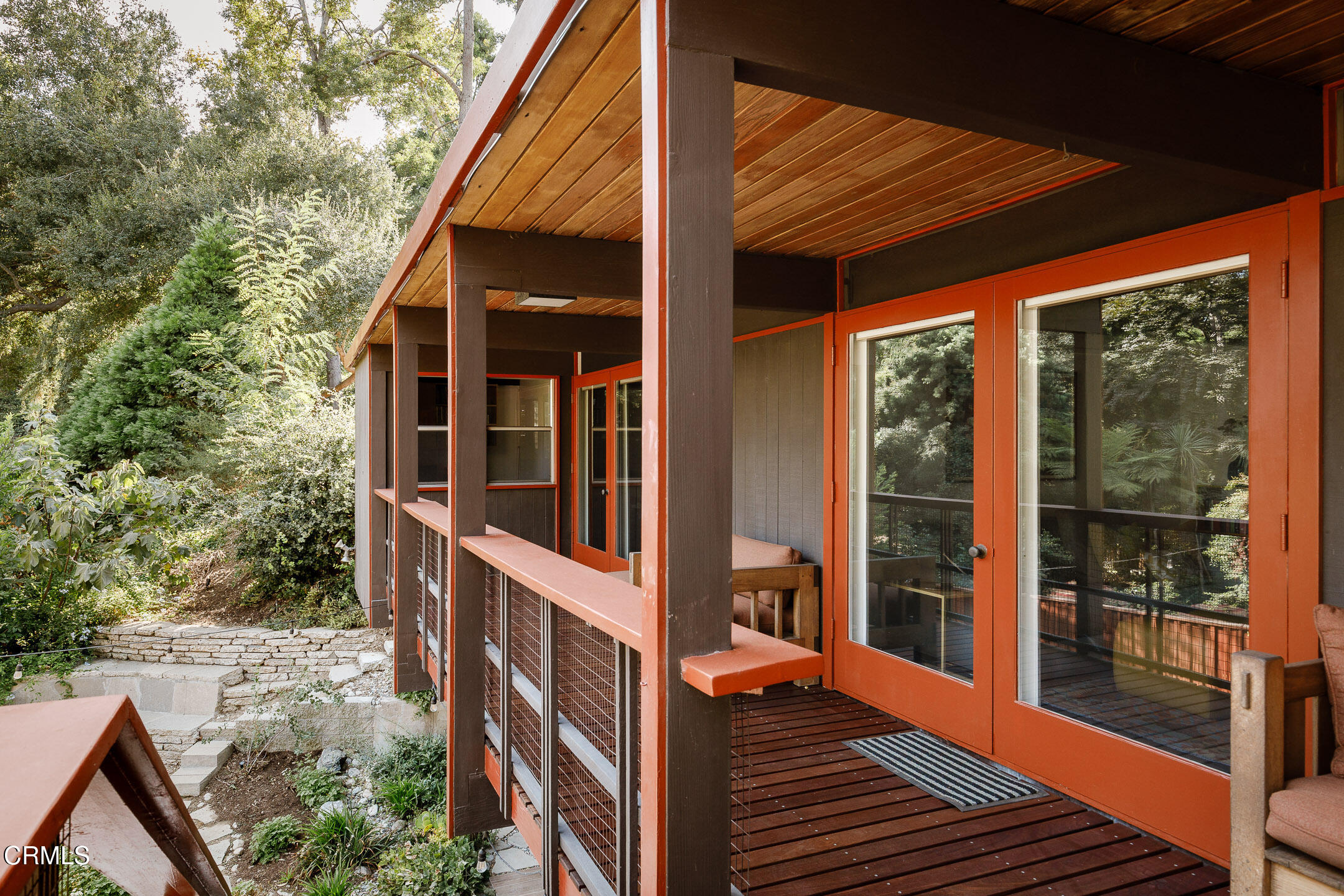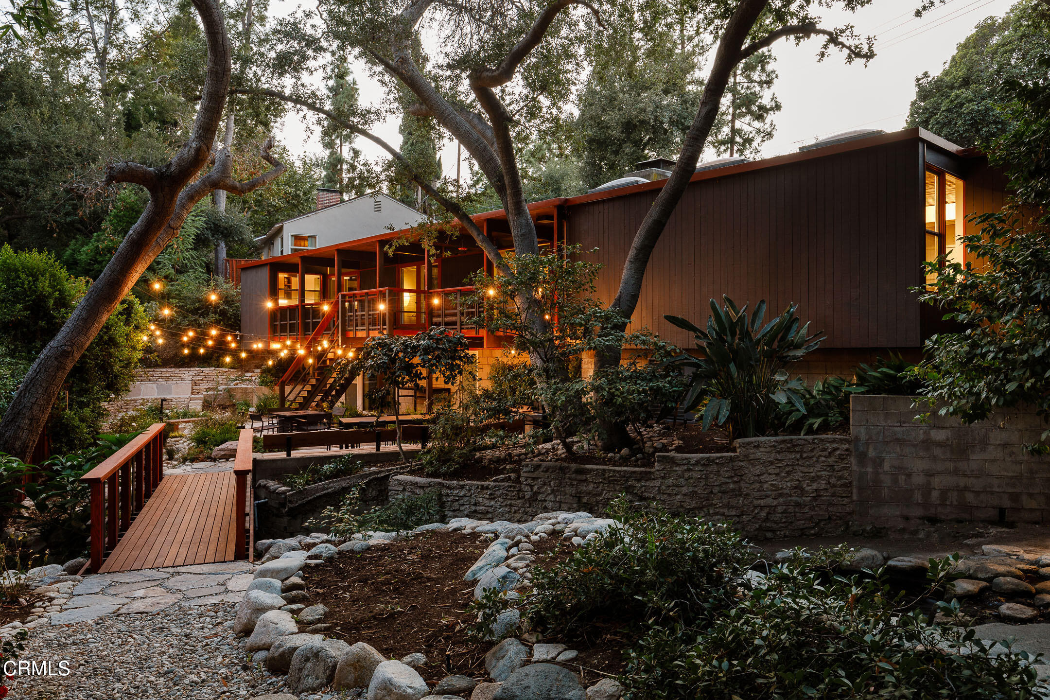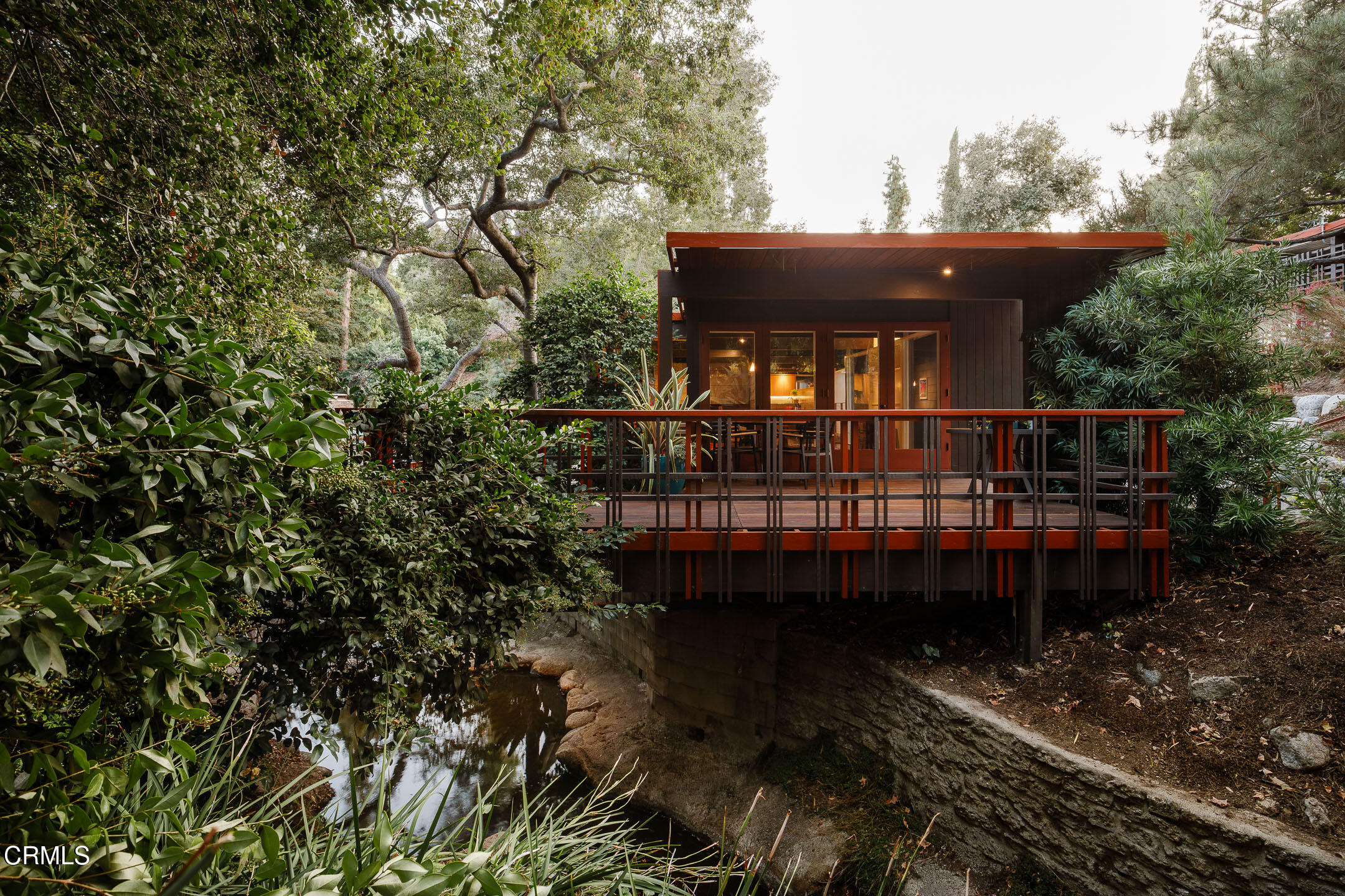 A Southwest Pasadena masterwork of Post & Beam Modernism, designed by Buff, Straub & Hensman, FAIA - nestled from view within a cluster of trees and uniquely sited to take advantage of the natural 'small suburban stream' that gently meanders through the property. Originally built in 1954, the architectural triumph is achieved through the simplicity of its rectangular programmatic design and restrained compilation of concrete, douglas fir and walls of glass. Extensive balconies, terracing, bridges and staircases connect one to the many layers of the pastoral outdoors - including entertaining decks, patios, vegetable beds, pathways, cascading ponds and conversational firepit. Center mounted front door vestibule allows one to seamlessly access both the public and private spaces of the residence. The living room features cork flooring, a low-slung built-in bench with adjacent seating, anchored by a wide-hearth rough concrete block fireplace that separates the living room from the remodeled kitchen featuring new cabinets, quartz countertops, floors and Miele appliances - all while preserving the original tile backsplash. Abundant storage is cleverly disguised as a pony wall that separates the kitchen from the primary corridor. Spacious primary bedroom, with separate adjacent office, direct patio access and added bathroom with single-piece concrete sink and countertop. Two additional bedrooms on the upper level, as well as a Jack and Jill bathroom 'garden' featured in a 1956 issue of Sunset Magazine with a flanking sink/lavatory, separated by a tiled sunken bath and shower - all overlooking a small Japanese garden. The lower level was developed and expanded to include bedroom, bathroom, laundry room, utilities and storage. Carport conveniently and discreetly positioned street side. See features document for upgraded systems. The property is listed on the National Register of Historic Places and has Mills Act status.