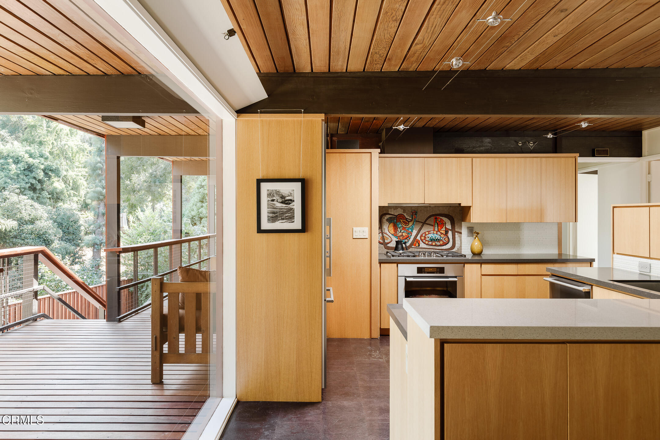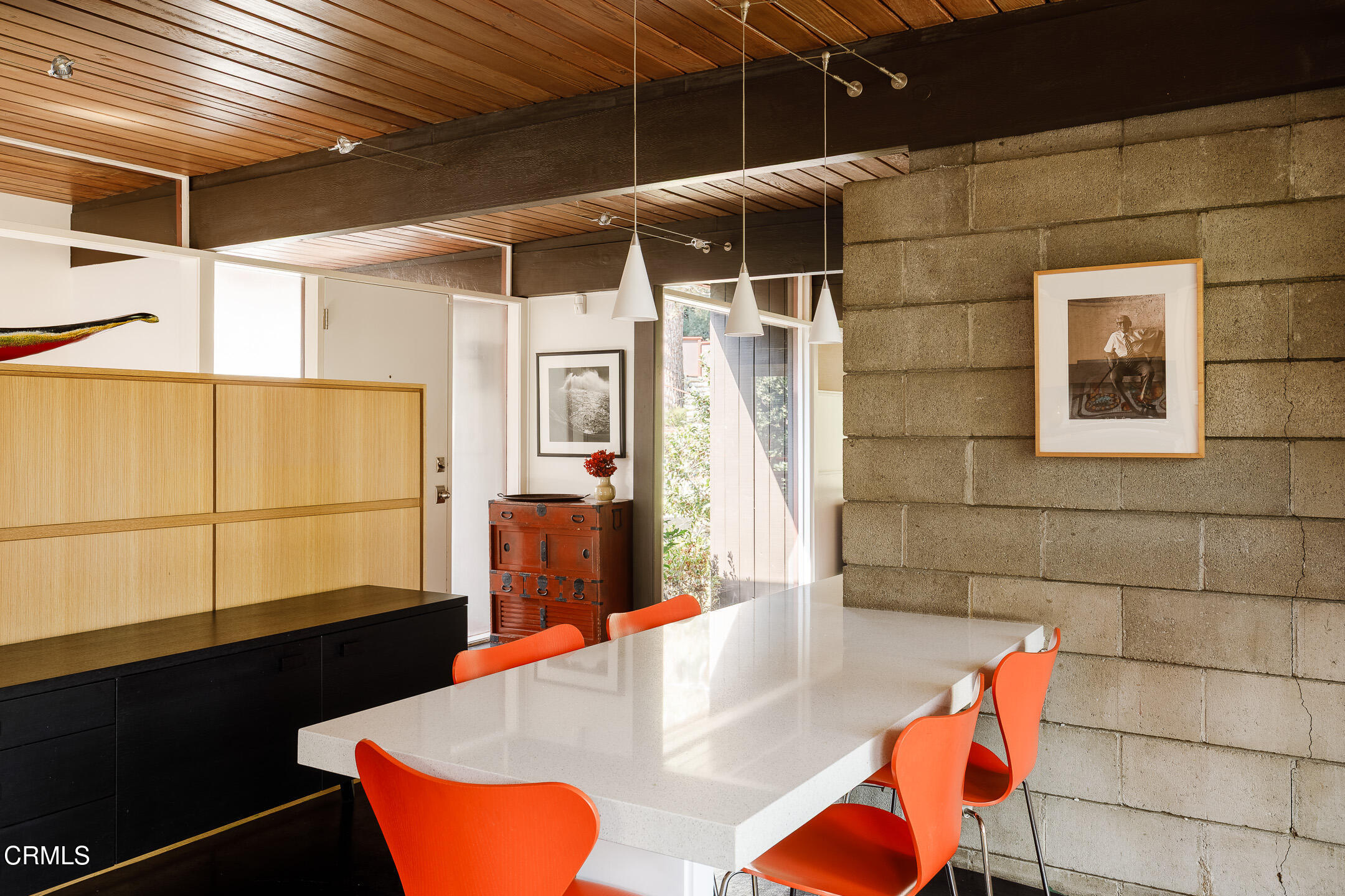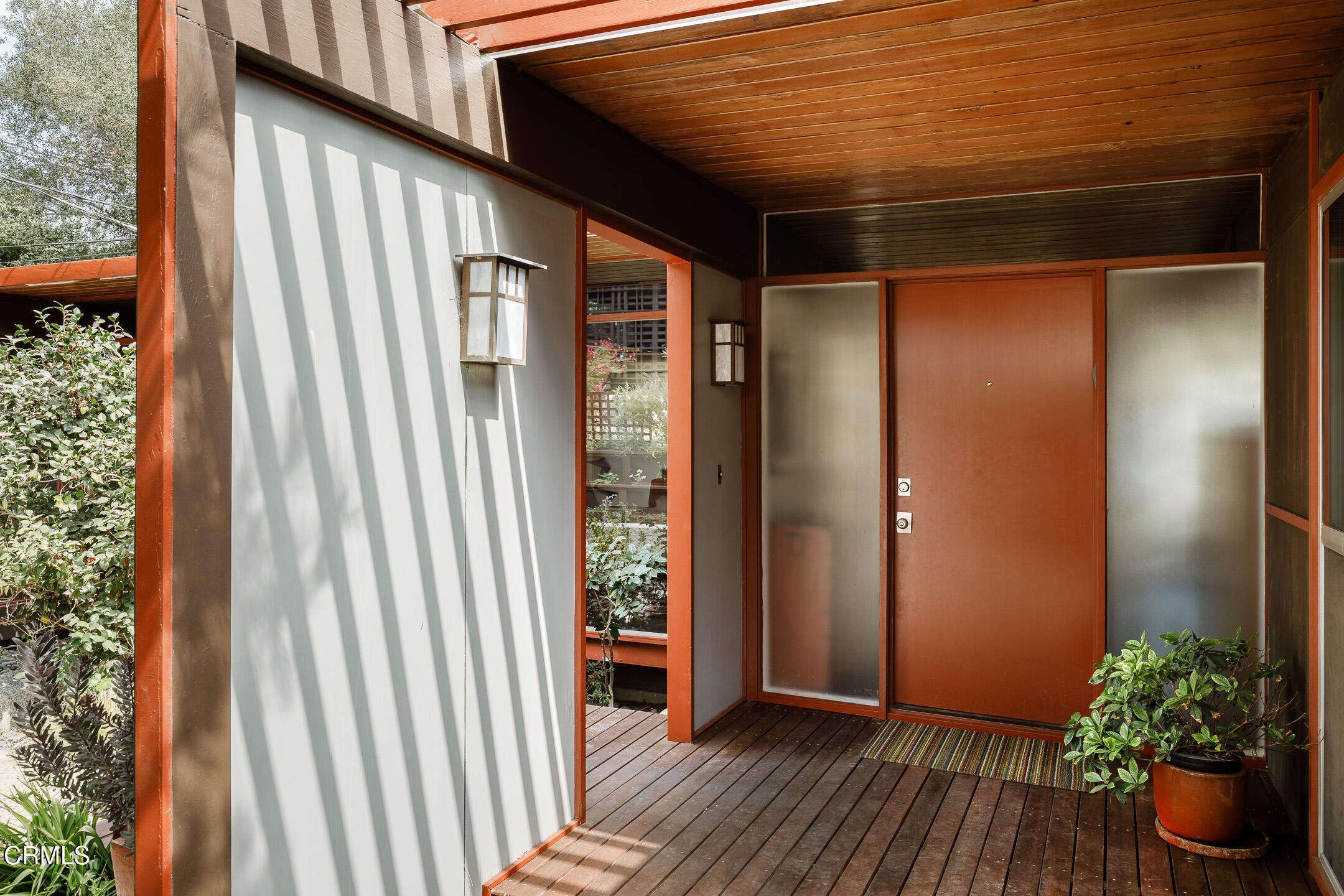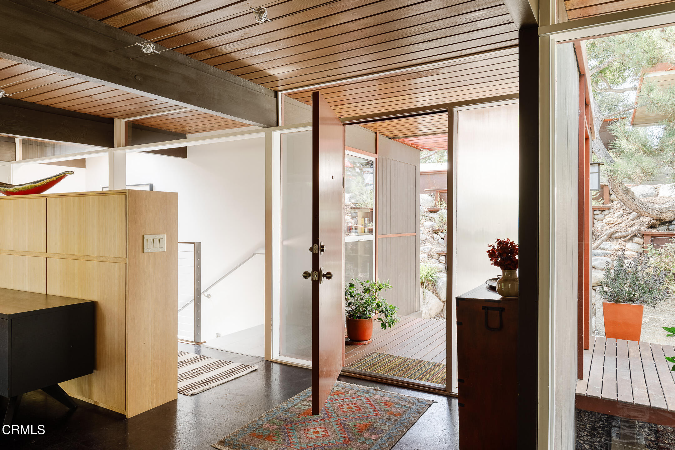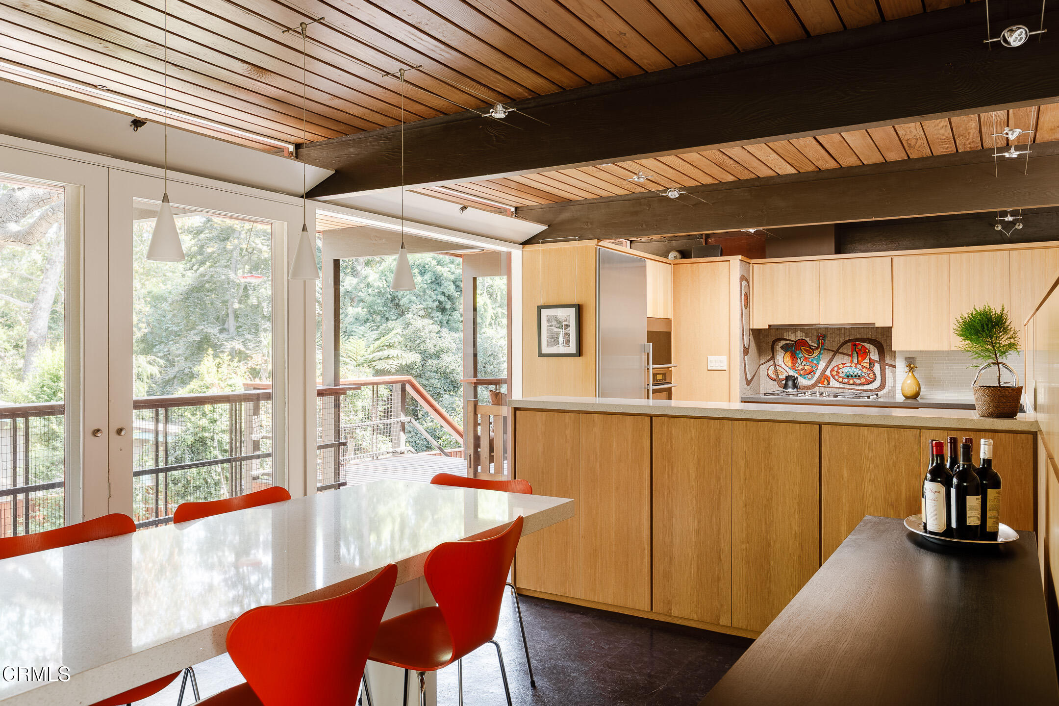 A Southwest Pasadena masterwork of Post & Beam Modernism, designed by Buff, Straub & Hensman, FAIA - nestled from view within a cluster of trees and uniquely sited to take advantage of the natural 'small suburban stream' that gently meanders through the property. Originally built in 1954, the architectural triumph is achieved through the simplicity of its rectangular programmatic design and restrained compilation of concrete, douglas fir and walls of glass. Extensive balconies, terracing, bridges and staircases connect one to the many layers of the pastoral outdoors - including entertaining decks, patios, vegetable beds, pathways, cascading ponds and conversational firepit. Center mounted front door vestibule allows one to seamlessly access both the public and private spaces of the residence. The living room features cork flooring, a low-slung built-in bench with adjacent seating, anchored by a wide-hearth rough concrete block fireplace that separates the living room from the remodeled kitchen featuring new cabinets, quartz countertops, floors and Miele appliances - all while preserving the original tile backsplash. Abundant storage is cleverly disguised as a pony wall that separates the kitchen from the primary corridor. Spacious primary bedroom, with separate adjacent office, direct patio access and added bathroom with single-piece concrete sink and countertop. Two additional bedrooms on the upper level, as well as a Jack and Jill bathroom 'garden' featured in a 1956 issue of Sunset Magazine with a flanking sink/lavatory, separated by a tiled sunken bath and shower - all overlooking a small Japanese garden. The lower level was developed and expanded to include bedroom, bathroom, laundry room, utilities and storage. Carport conveniently and discreetly positioned street side. See features document for upgraded systems. The property is listed on the National Register of Historic Places and has Mills Act status.
