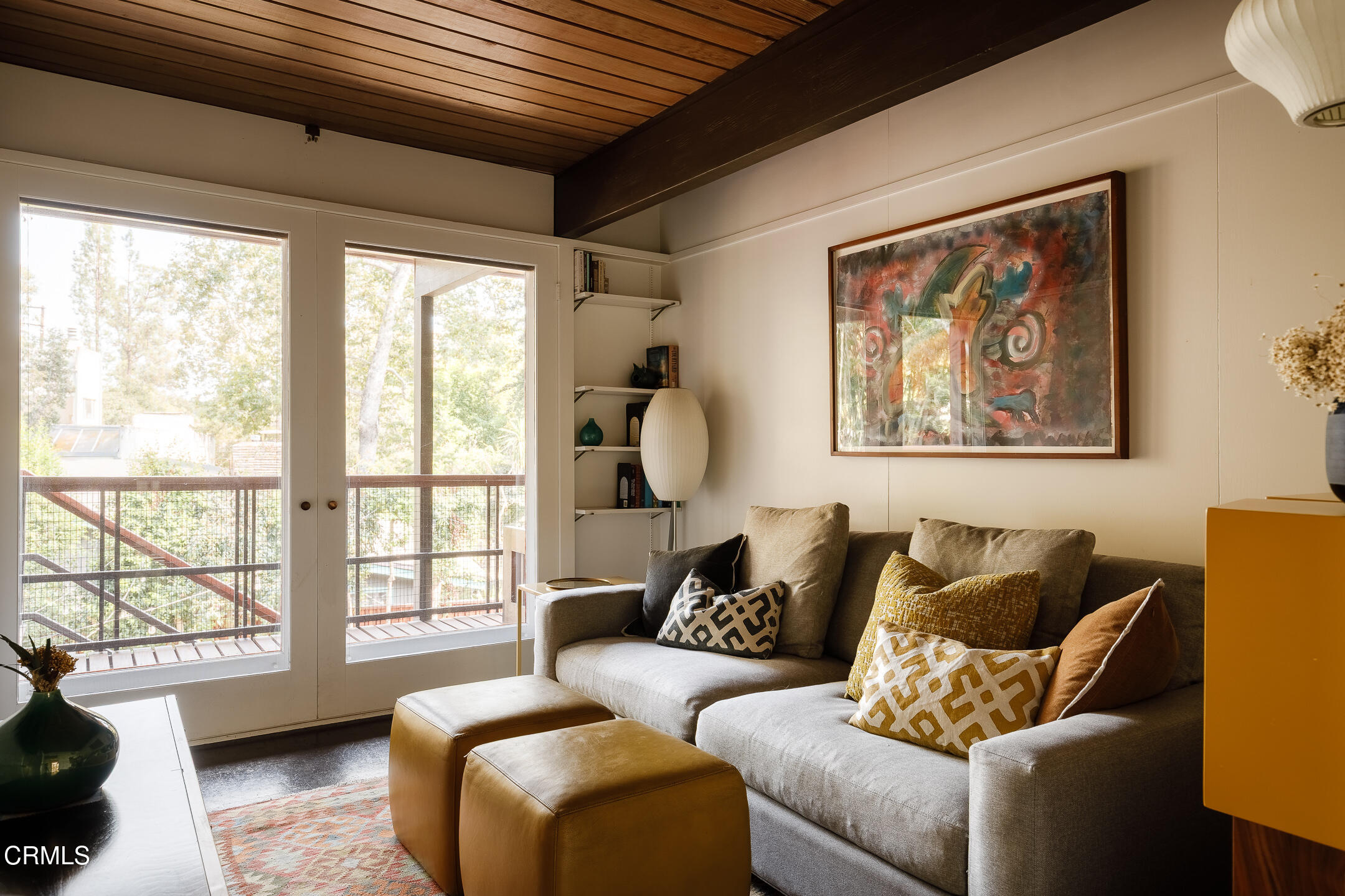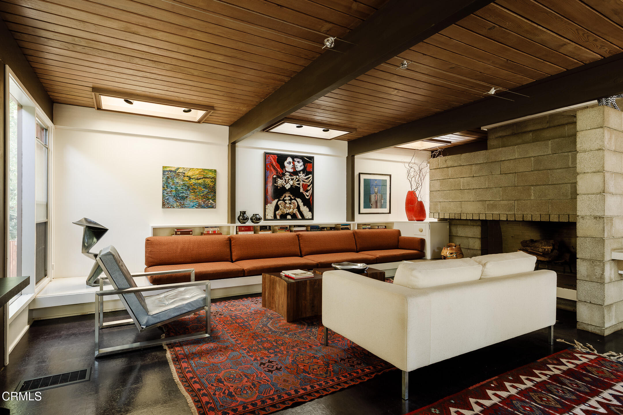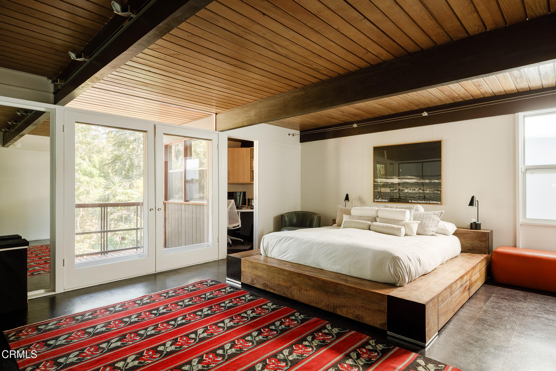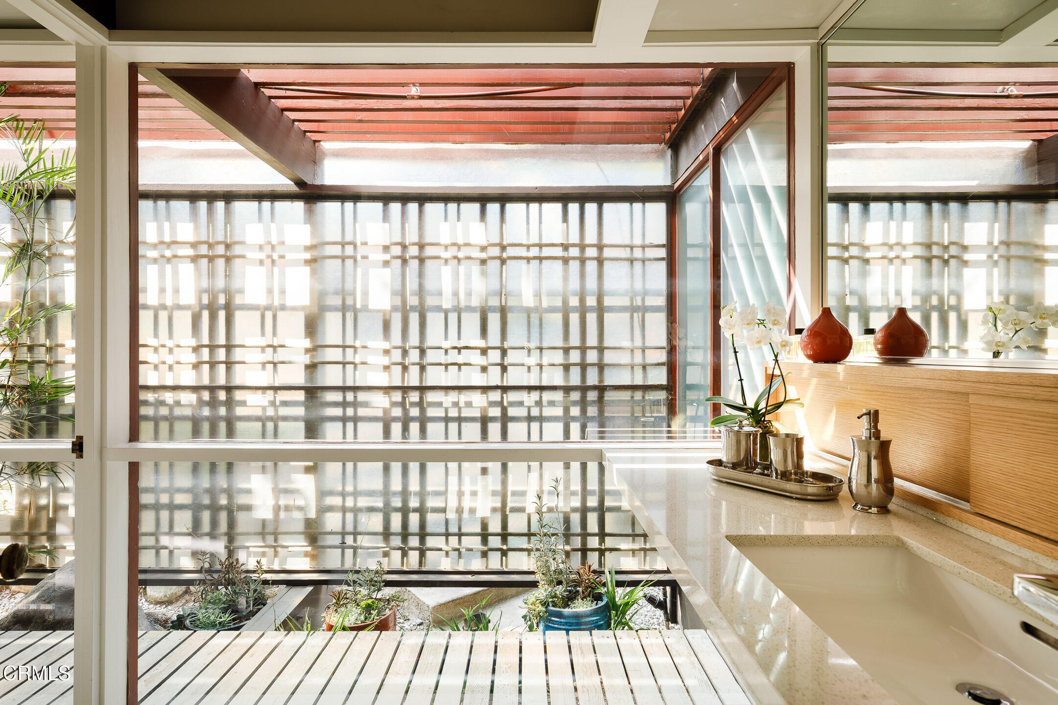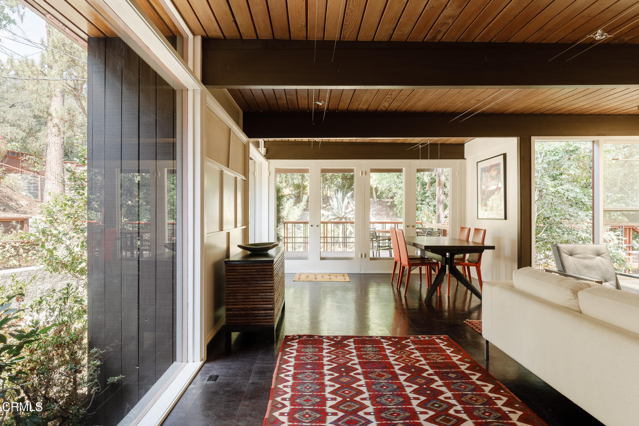 A Southwest Pasadena masterwork of Post & Beam Modernism, designed by Buff, Straub & Hensman, FAIA - nestled from view within a cluster of trees and uniquely sited to take advantage of the natural 'small suburban stream' that gently meanders through the property. Originally built in 1954, the architectural triumph is achieved through the simplicity of its rectangular programmatic design and restrained compilation of concrete, douglas fir and walls of glass. Extensive balconies, terracing, bridges and staircases connect one to the many layers of the pastoral outdoors - including entertaining decks, patios, vegetable beds, pathways, cascading ponds and conversational firepit. Center mounted front door vestibule allows one to seamlessly access both the public and private spaces of the residence. The living room features cork flooring, a low-slung built-in bench with adjacent seating, anchored by a wide-hearth rough concrete block fireplace that separates the living room from the remodeled kitchen featuring new cabinets, quartz countertops, floors and Miele appliances - all while preserving the original tile backsplash. Abundant storage is cleverly disguised as a pony wall that separates the kitchen from the primary corridor. Spacious primary bedroom, with separate adjacent office, direct patio access and added bathroom with single-piece concrete sink and countertop. Two additional bedrooms on the upper level, as well as a Jack and Jill bathroom 'garden' featured in a 1956 issue of Sunset Magazine with a flanking sink/lavatory, separated by a tiled sunken bath and shower - all overlooking a small Japanese garden. The lower level was developed and expanded to include bedroom, bathroom, laundry room, utilities and storage. Carport conveniently and discreetly positioned street side. See features document for upgraded systems. The property is listed on the National Register of Historic Places and has Mills Act status.
