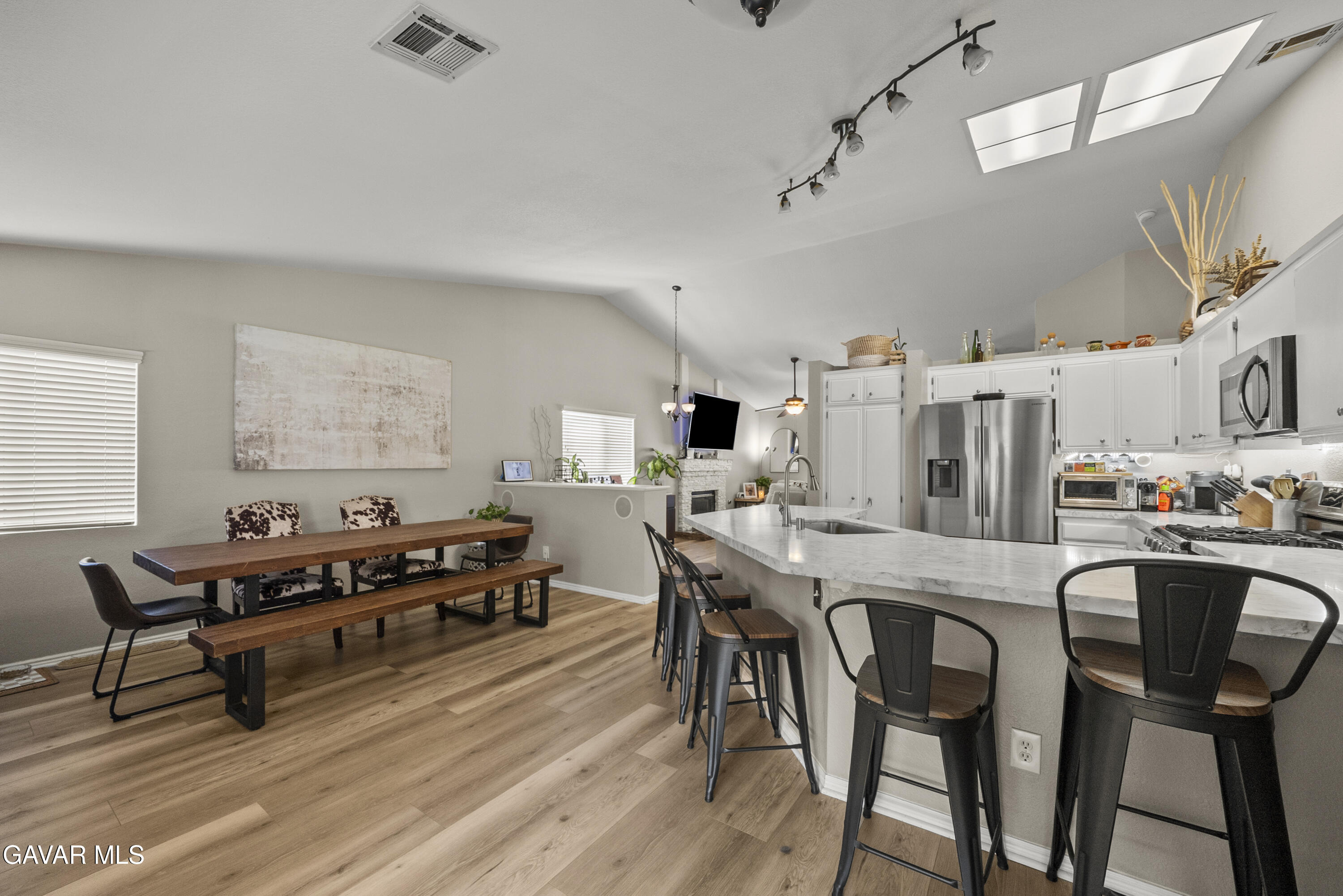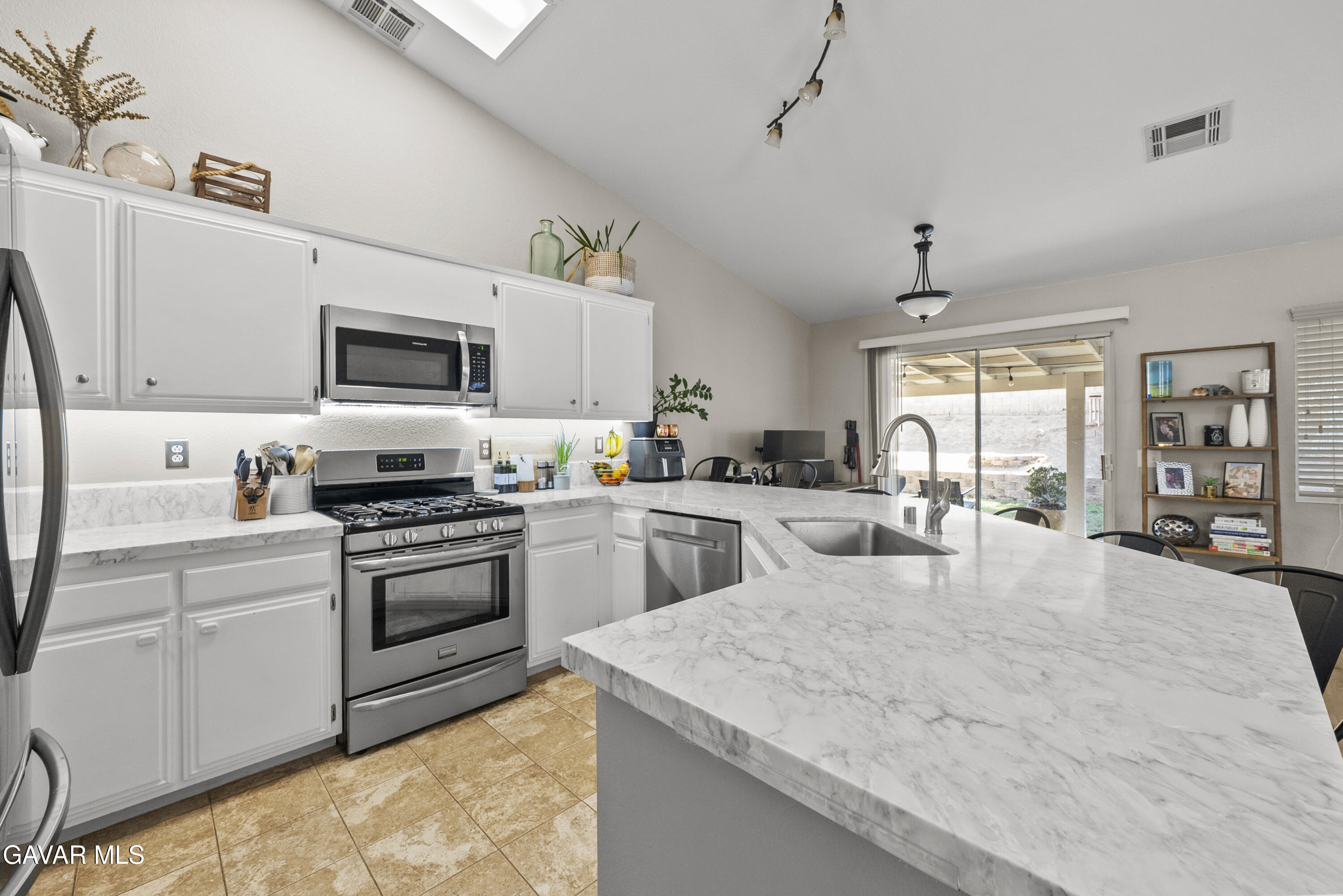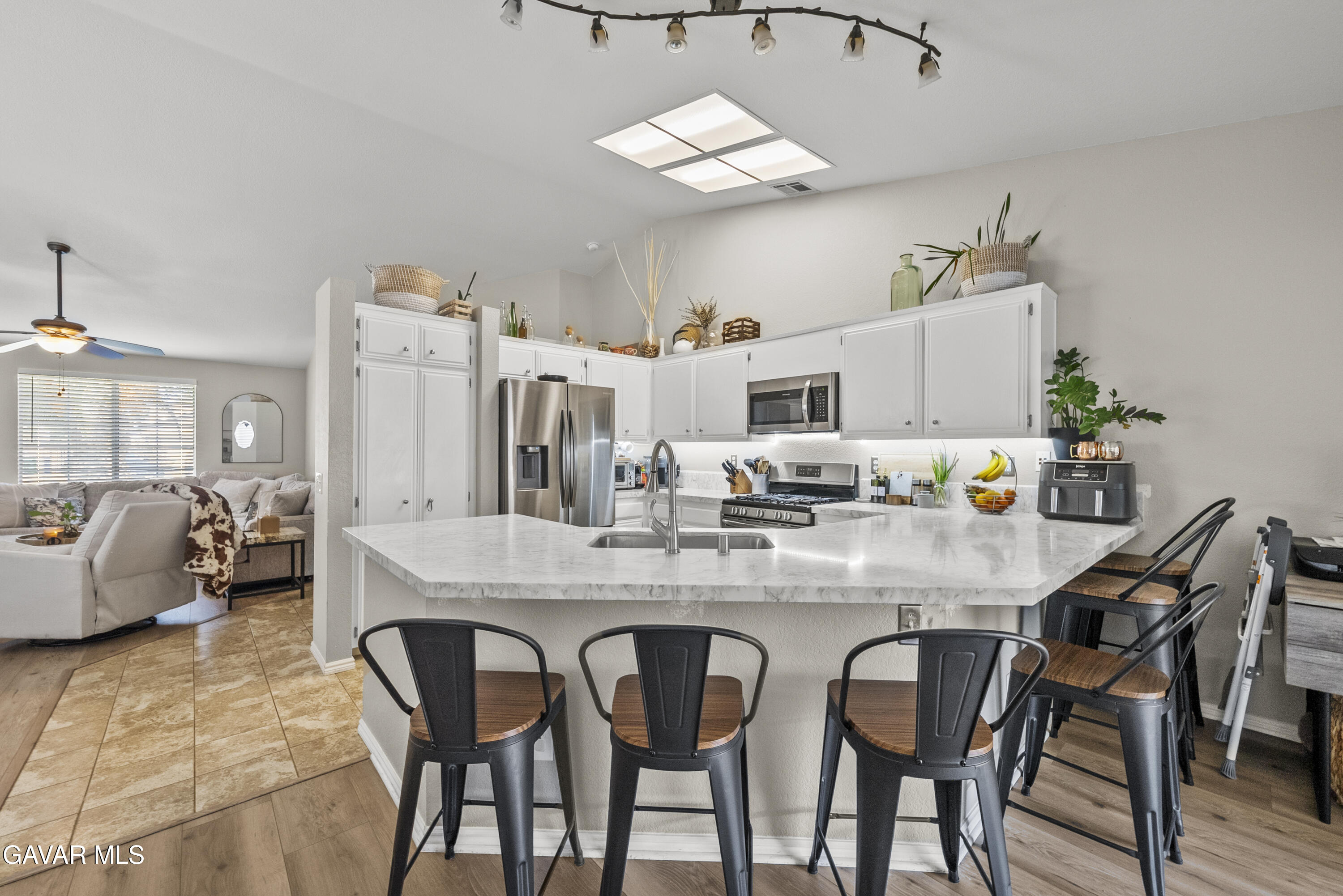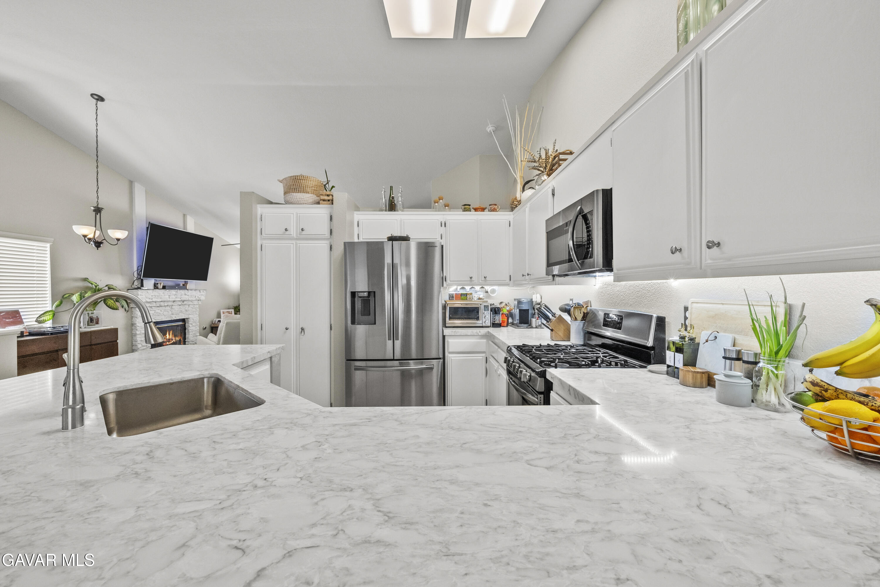 Charming Rancho Vista Single-Story! Located in the heart of Rancho Vista, just steps from the golf course, neighborhood park, and top-rated schools, this beautifully maintained 4-bedroom, 2-bath home is move-in ready. The open kitchen features sleek quartz countertops, stainless steel appliances, and flows seamlessly into the living spaces with wood laminate flooring and tile walkways for a clean, modern feel. Cozy up this winter by the inviting fireplace in the spacious living room. The primary suite boasts a large tiled shower, dual vanities, and a walk-in closet. Convenient indoor laundry adds ease to daily living, while the private backyard with a covered patio and block wall fencing is perfect for entertaining. A 3-car garage completes the package, offering plenty of storage. Don't miss this perfect blend of comfort, convenience, and style in one of Palmdale's most sought-after neighborhoods!