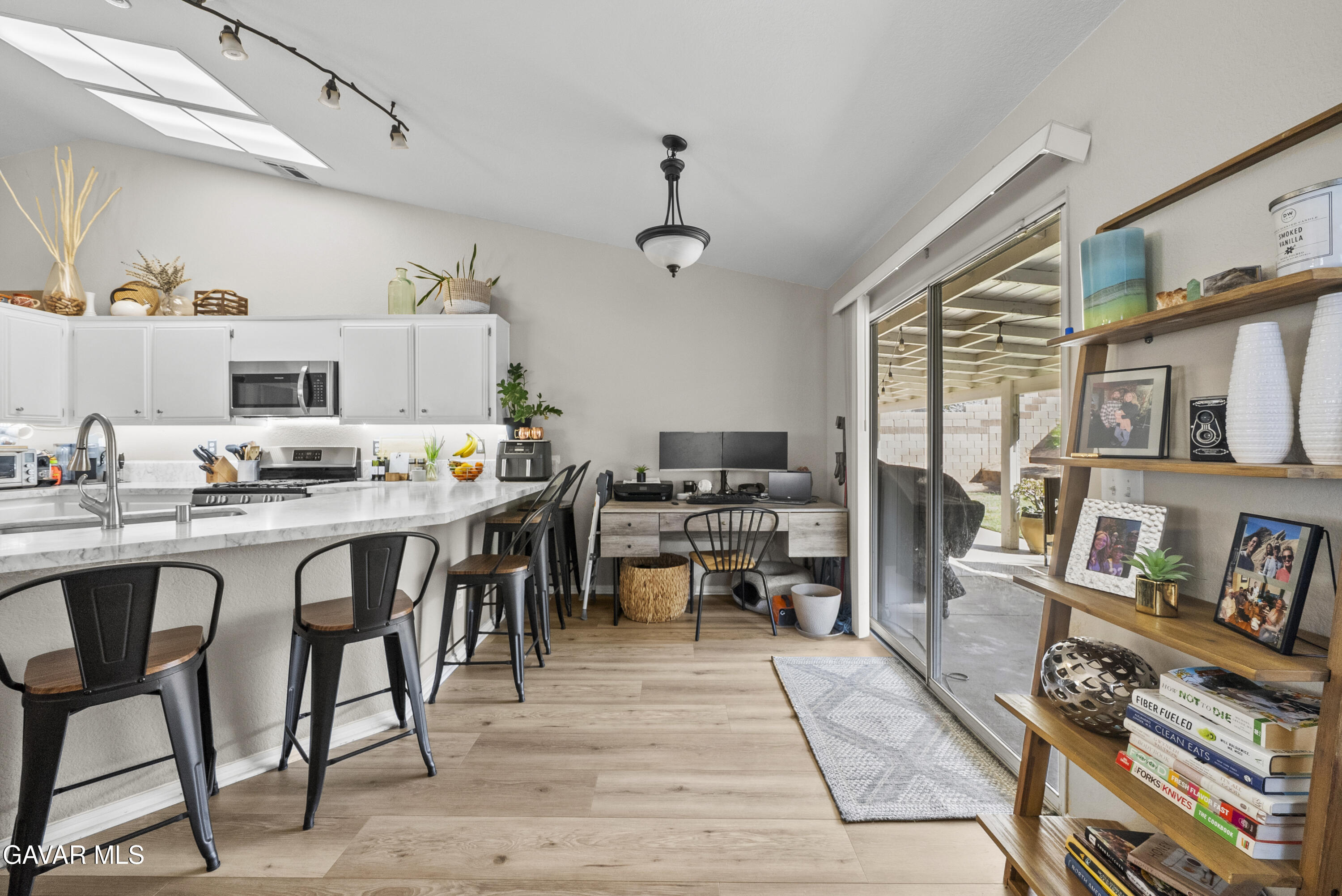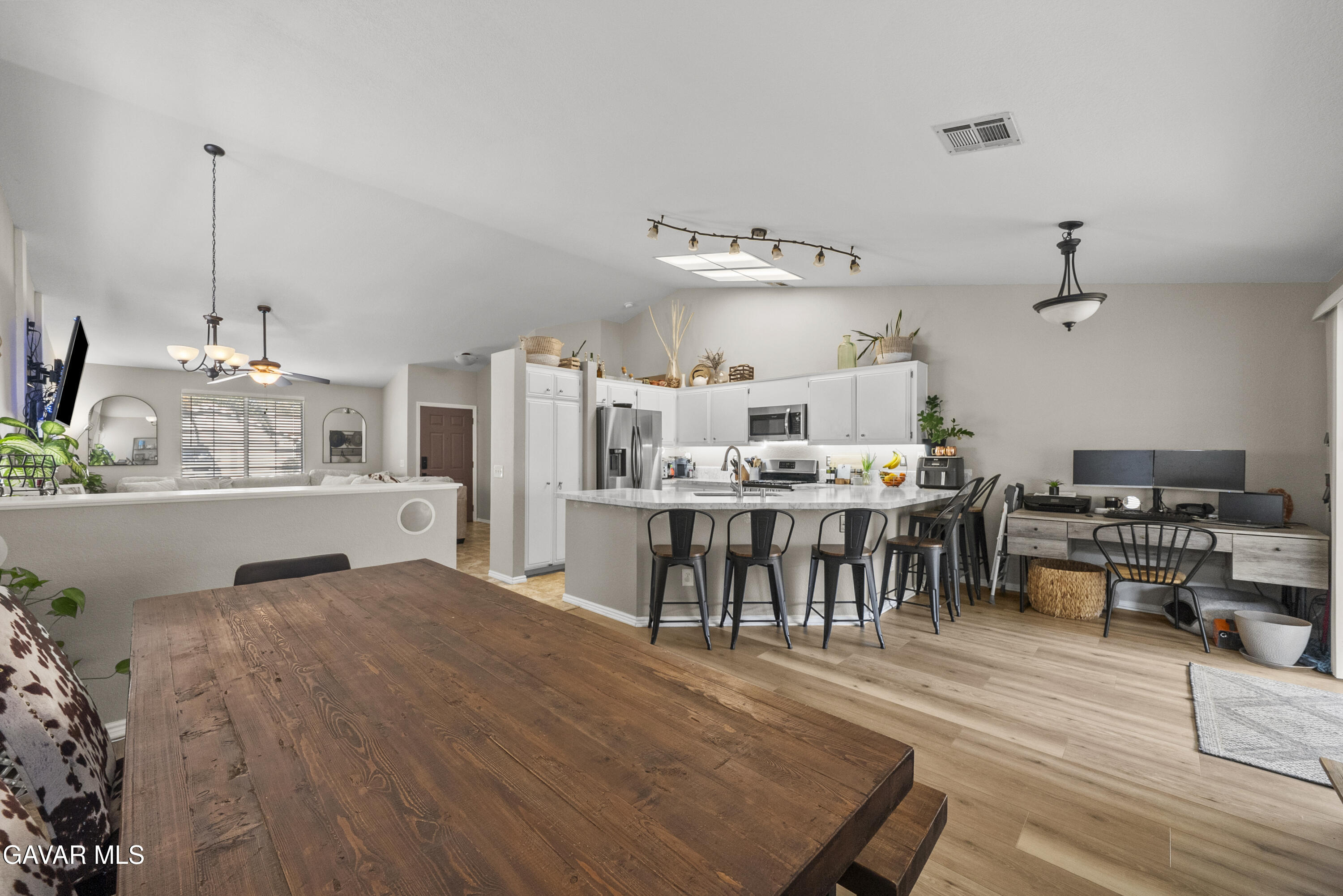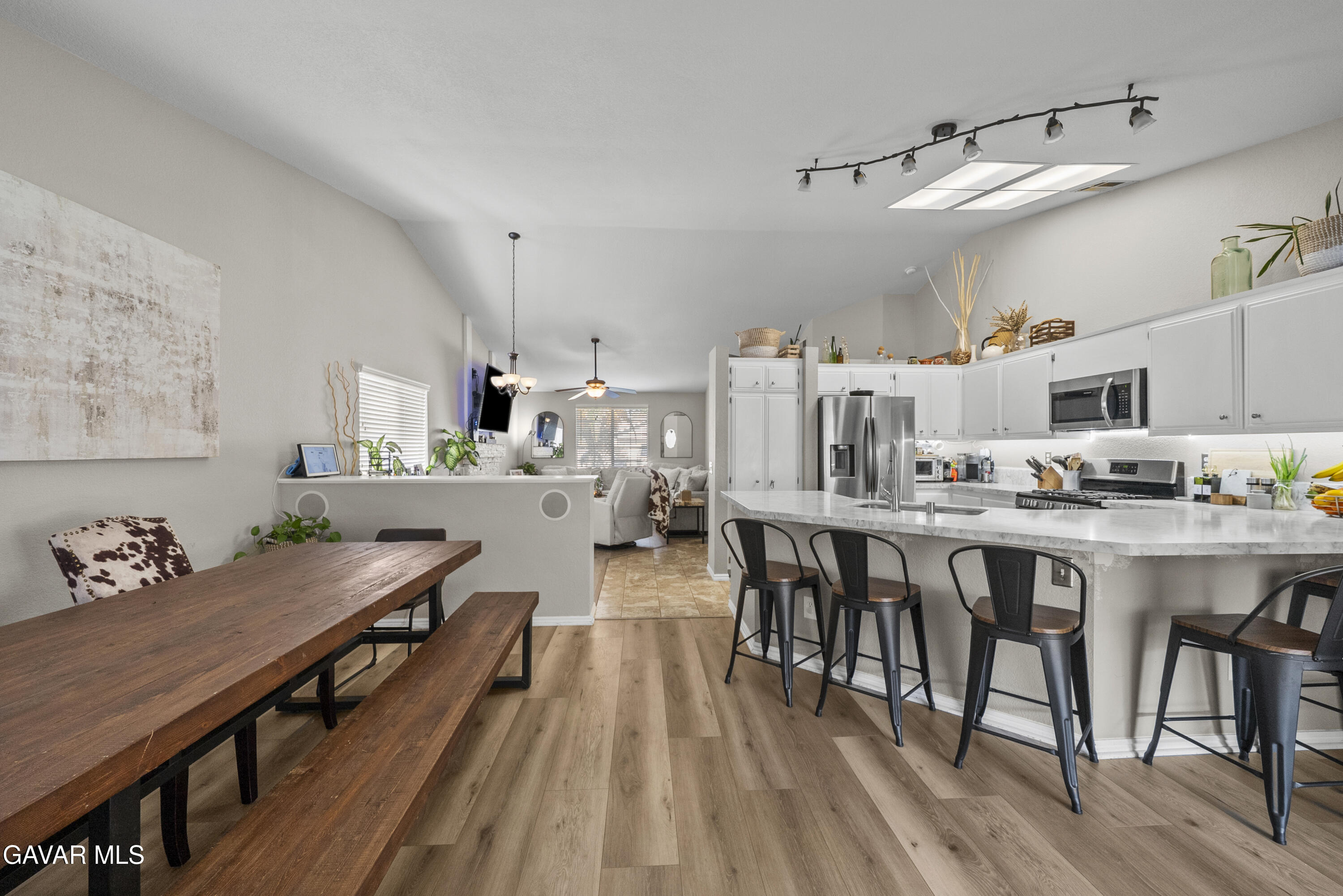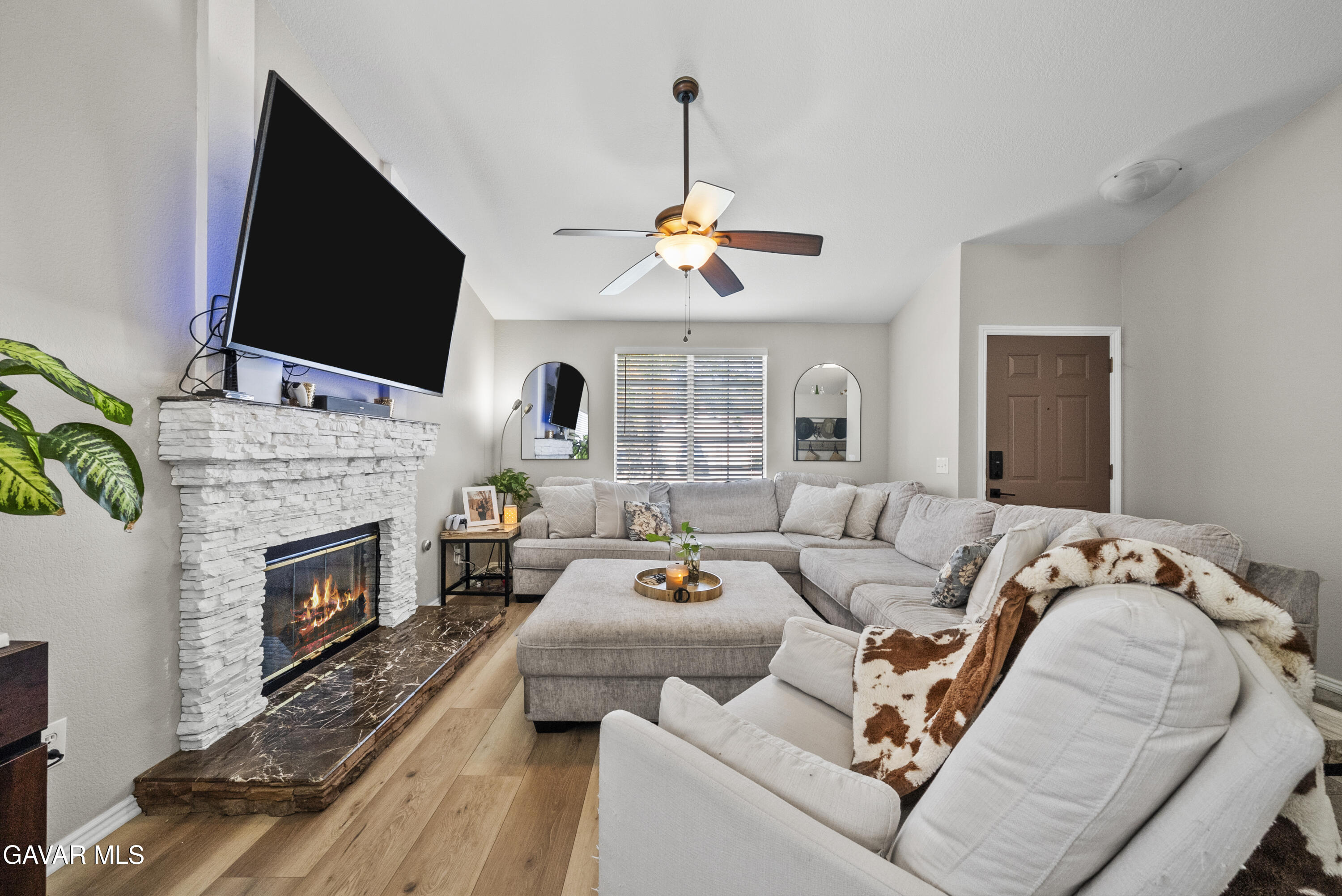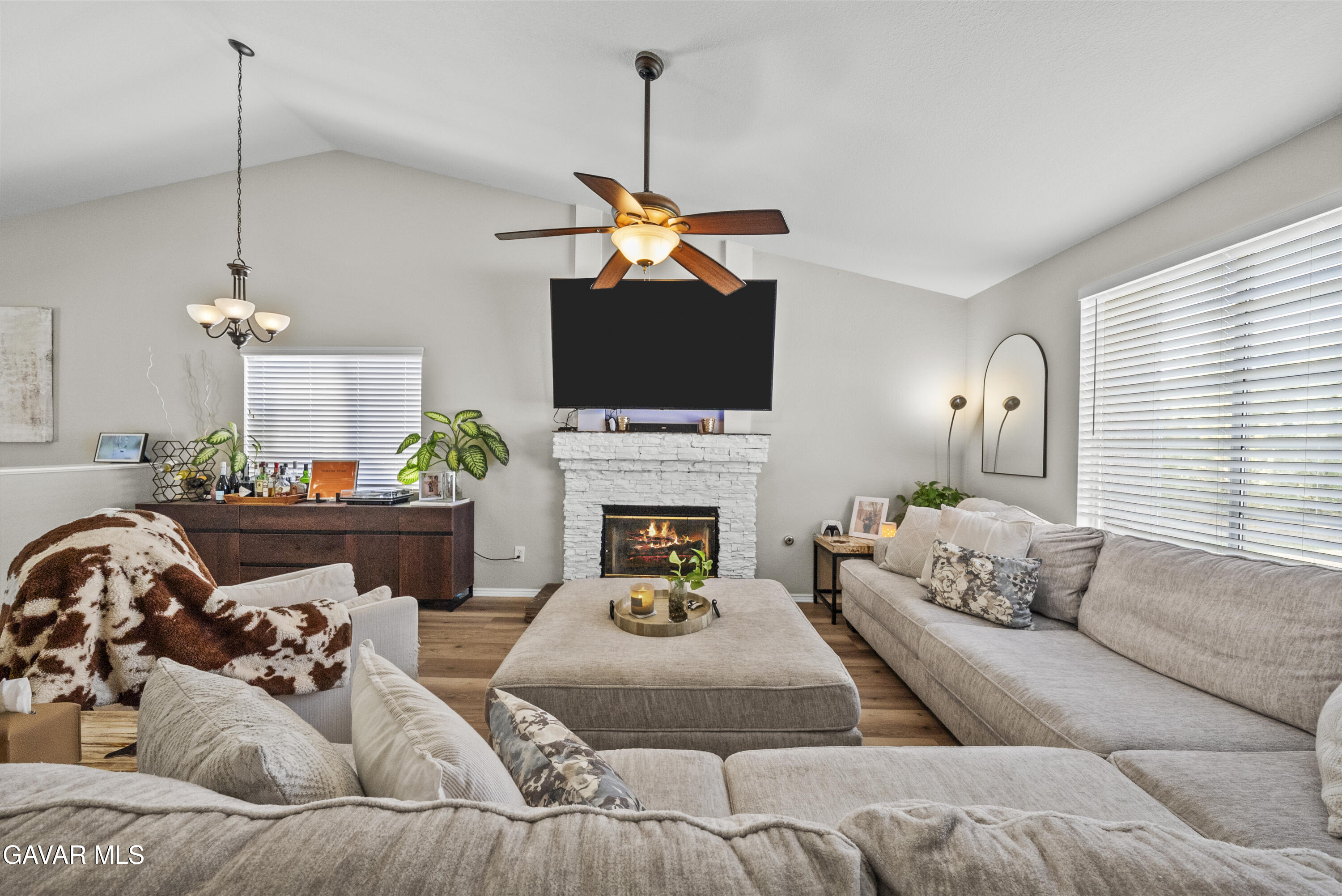 Charming Rancho Vista Single-Story! Located in the heart of Rancho Vista, just steps from the golf course, neighborhood park, and top-rated schools, this beautifully maintained 4-bedroom, 2-bath home is move-in ready. The open kitchen features sleek quartz countertops, stainless steel appliances, and flows seamlessly into the living spaces with wood laminate flooring and tile walkways for a clean, modern feel. Cozy up this winter by the inviting fireplace in the spacious living room. The primary suite boasts a large tiled shower, dual vanities, and a walk-in closet. Convenient indoor laundry adds ease to daily living, while the private backyard with a covered patio and block wall fencing is perfect for entertaining. A 3-car garage completes the package, offering plenty of storage. Don't miss this perfect blend of comfort, convenience, and style in one of Palmdale's most sought-after neighborhoods!