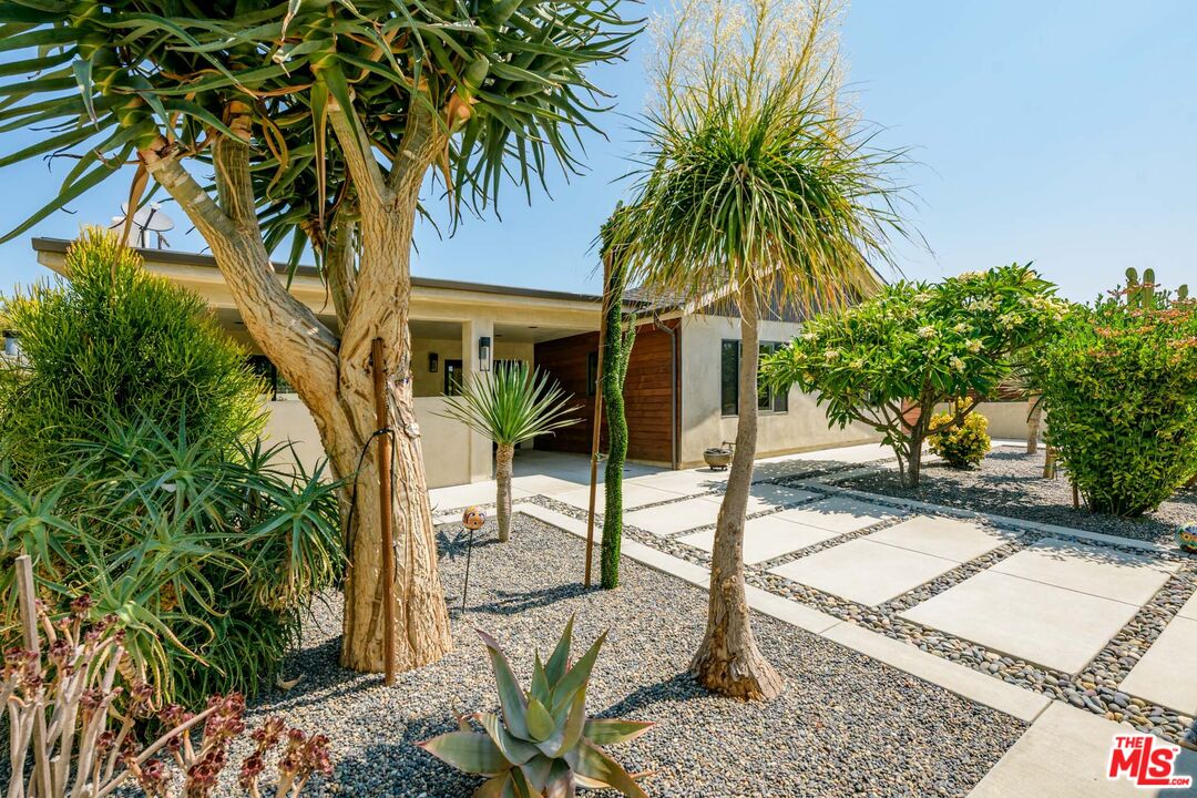 Beautifully renovated with designer details, this 3 bed / 2 bath home blends high-end finishes and thoughtful upgrades in a charming Valley locale. Featuring custom concrete walkways, serene water fountain, lush drought-tolerant landscaping and garden, Mexican river rock accents, and curated decking. The exterior includes smooth Santa Barbara stucco, an outdoor pool shower, custom accordion doors and pergola, iron gates, and Brazilian Ipe wood privacy fencing. Inside, enjoy real oak floors, South American porcelain tile, abundant natural light evoking an indoor-outdoor flow, and custom automatic blinds. The epicurean kitchen offers island seating, modern appliances, and open access to the formal dining room, with seamless transitions to al fresco dining by the pool. The primary suite boasts a spa-like bath with a Roman Jacuzzi tub, custom vanity, private outdoor seating, and stunning Missoni garden wallpaper. The backyard features a remodeled pool with Pentair system and an adjacent outdoor fire pit for relaxed evenings. The detached 2+ car garage, with epoxy floors and dual doors, offers ideal flex space for a gym, office, or creative studio. A true gem with exceptional private outdoor living, this home is a perfect combination of original architectural integrity and resort-style design. Close to The Vineyards at Porter Ranch, Fashion Center shopping, dining, entertainment, fitness, and local award-winning schools! Welcome home.