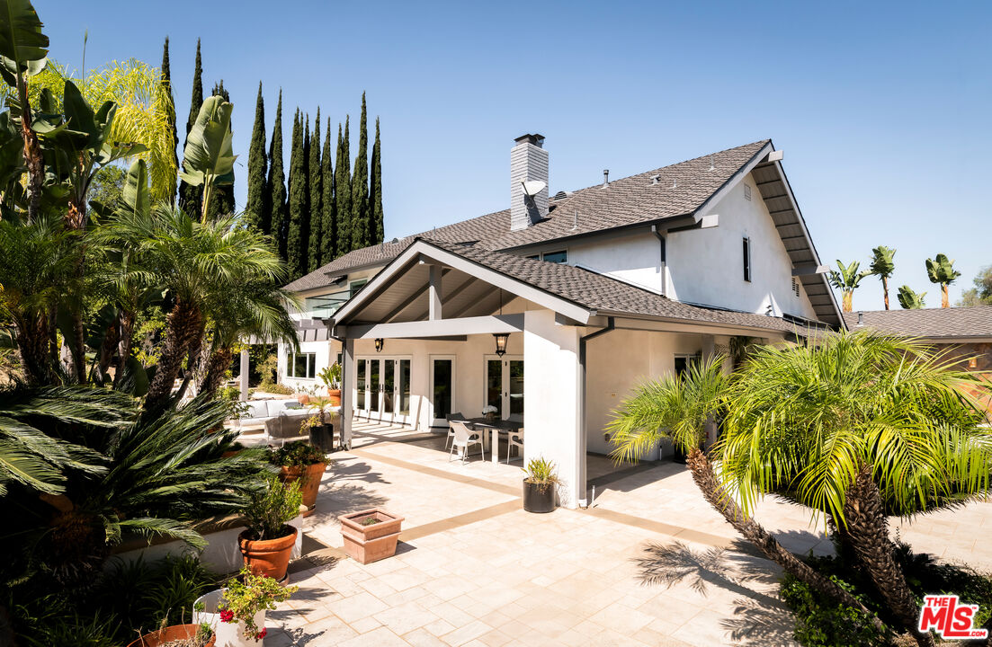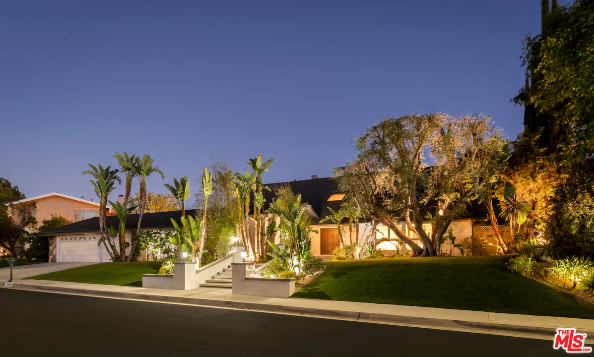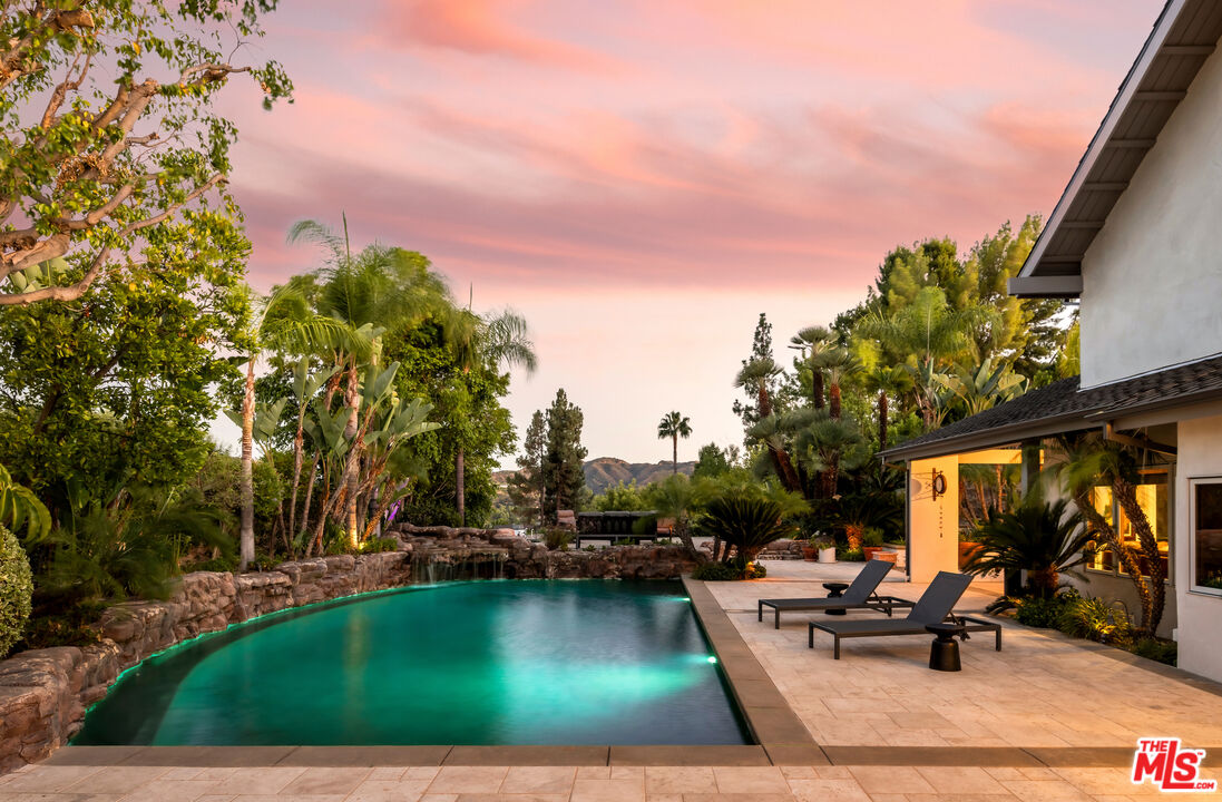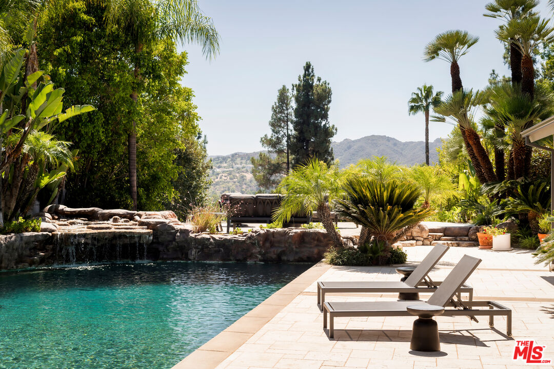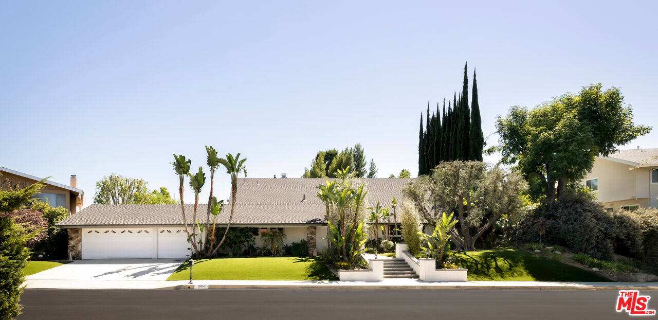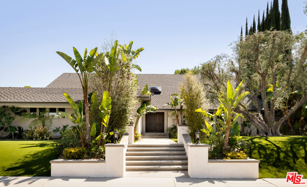 Where sleek Mid-Century design meets modern elegance, this turnkey Tarzana residence rests on a generous 17,000 SF lot within one of the neighborhood's most coveted enclaves. Set on a rare, flat cul-de-sac, the home offers a secluded sanctuary surrounded by lush landscaping and exceptional privacy. Spanning 4,424 SF, the two-level residence features 5 bedrooms, including a main-level primary suite and an upper-level primary retreat, along with an office, gym, and 5 bathrooms all thoughtfully designed for both comfort and style. The main level welcomes you with soaring ceilings and spacious living areas, including two additional bedrooms, a formal living room, dining room with a dedicated pantry for china and silver, family room with built-in bar, gourmet kitchen with Viking and Sub-Zero appliances, and a guest or staff suite. French doors open to a private backyard oasis complete with a heated pool and spa, built-in BBQ, and multiple dining and lounging areas. Upstairs, the upper-level primary retreat occupies the entire floor, featuring a charming fireplace, balcony with resort-like views of the grounds and mountains, and a spa-inspired ensuite with a soaking tub, steam shower, walk-in closet, and versatile spaces for an office, media room, gym, and more. Combining iconic Mid-Century design, modern finishes, and unparalleled indoor-outdoor living, this residence offers an exclusive opportunity to enjoy timeless elegance in one of the Valley's most sought-after neighborhoods.