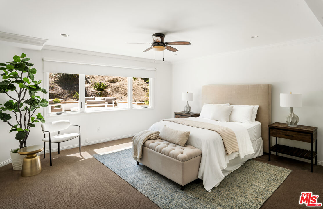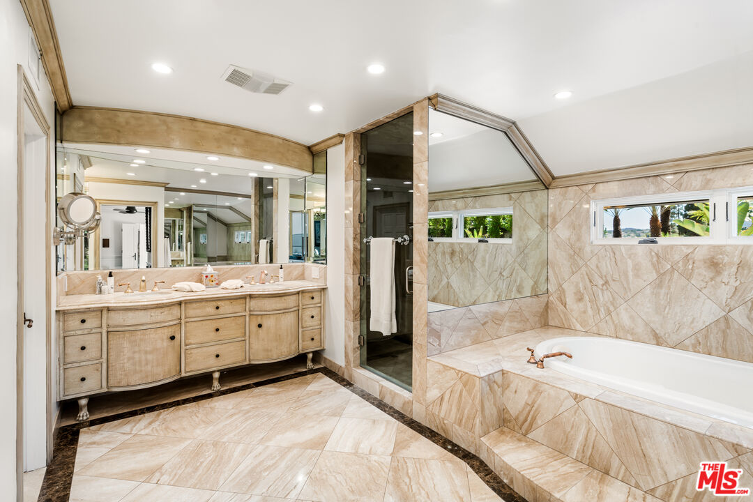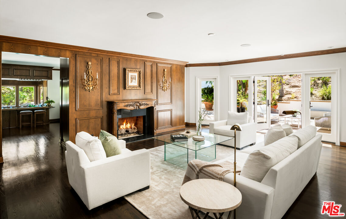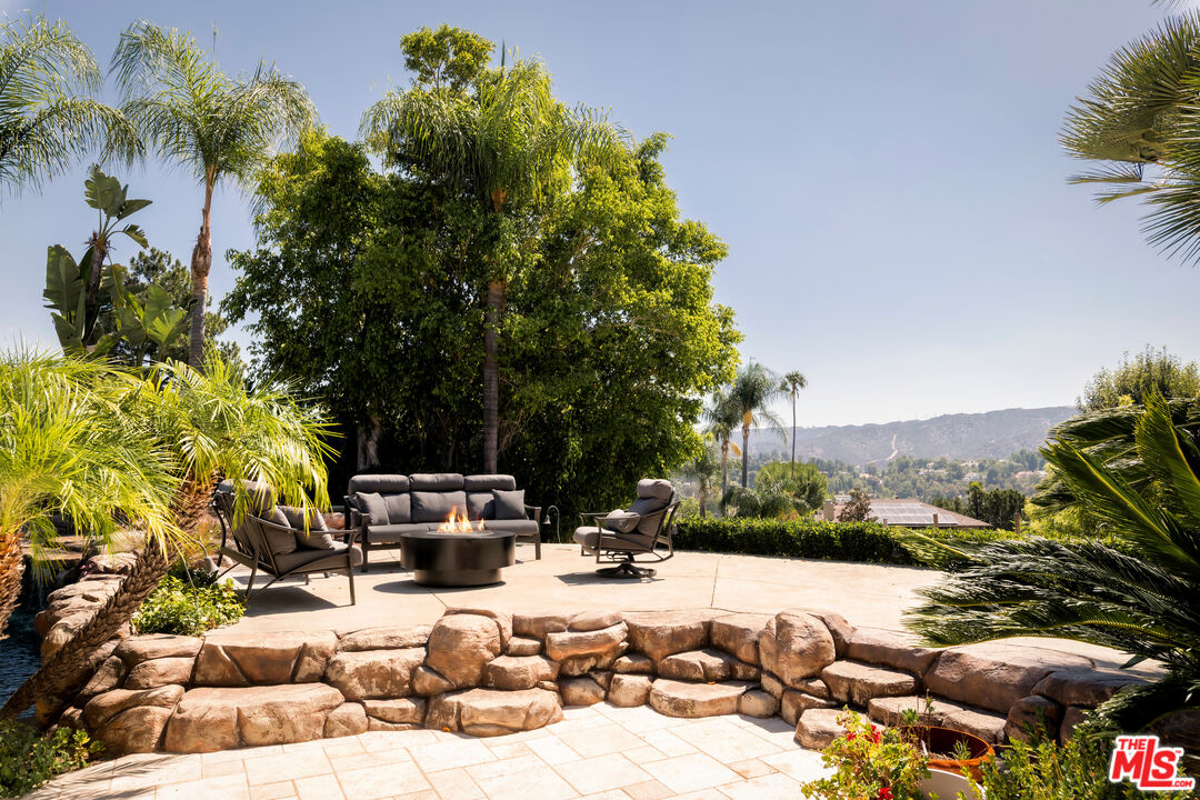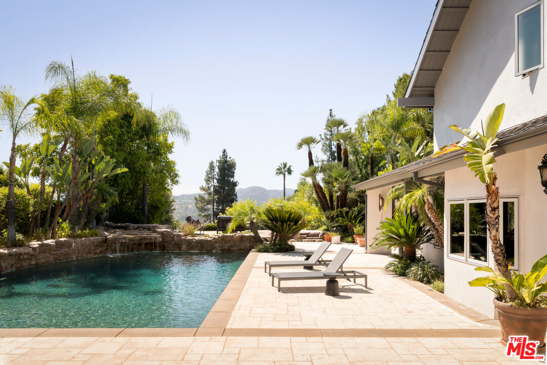 Where sleek Mid-Century design meets modern elegance, this turnkey Tarzana residence rests on a generous 17,000 SF lot within one of the neighborhood's most coveted enclaves. Set on a rare, flat cul-de-sac, the home offers a secluded sanctuary surrounded by lush landscaping and exceptional privacy. Spanning 4,424 SF, the two-level residence features 5 bedrooms, including a main-level primary suite and an upper-level primary retreat, along with an office, gym, and 5 bathrooms all thoughtfully designed for both comfort and style. The main level welcomes you with soaring ceilings and spacious living areas, including two additional bedrooms, a formal living room, dining room with a dedicated pantry for china and silver, family room with built-in bar, gourmet kitchen with Viking and Sub-Zero appliances, and a guest or staff suite. French doors open to a private backyard oasis complete with a heated pool and spa, built-in BBQ, and multiple dining and lounging areas. Upstairs, the upper-level primary retreat occupies the entire floor, featuring a charming fireplace, balcony with resort-like views of the grounds and mountains, and a spa-inspired ensuite with a soaking tub, steam shower, walk-in closet, and versatile spaces for an office, media room, gym, and more. Combining iconic Mid-Century design, modern finishes, and unparalleled indoor-outdoor living, this residence offers an exclusive opportunity to enjoy timeless elegance in one of the Valley's most sought-after neighborhoods.