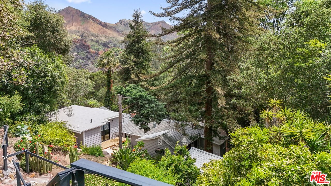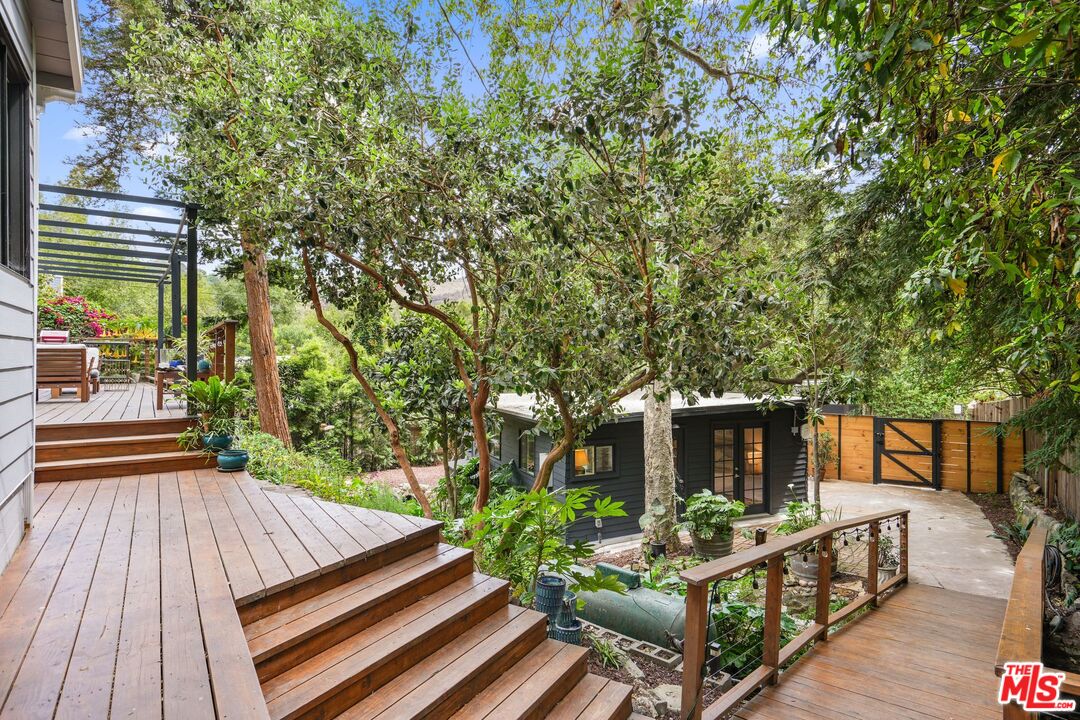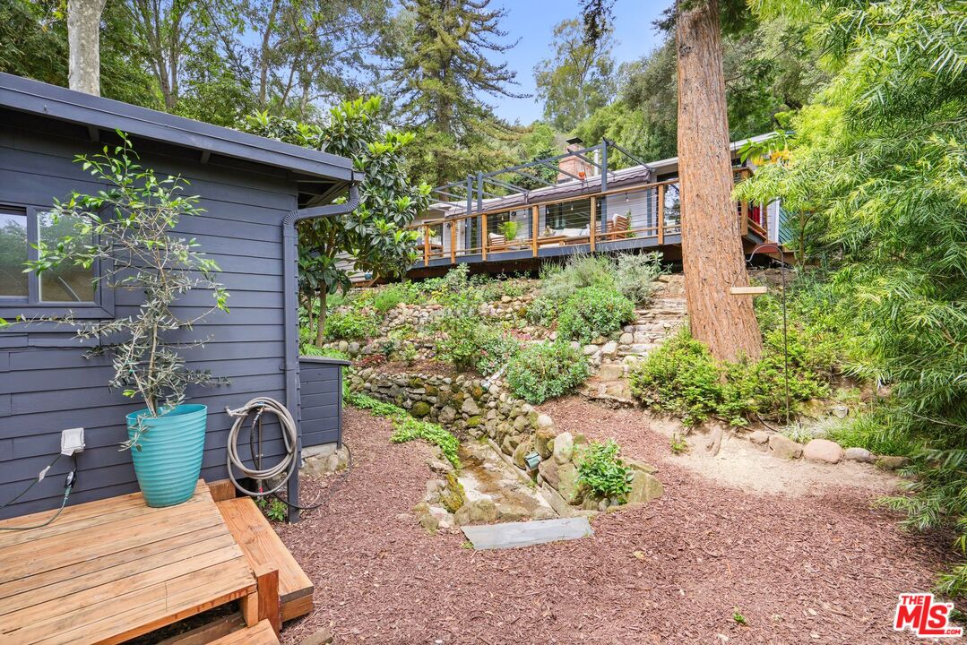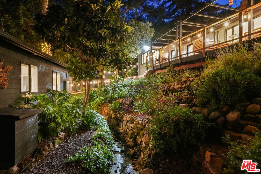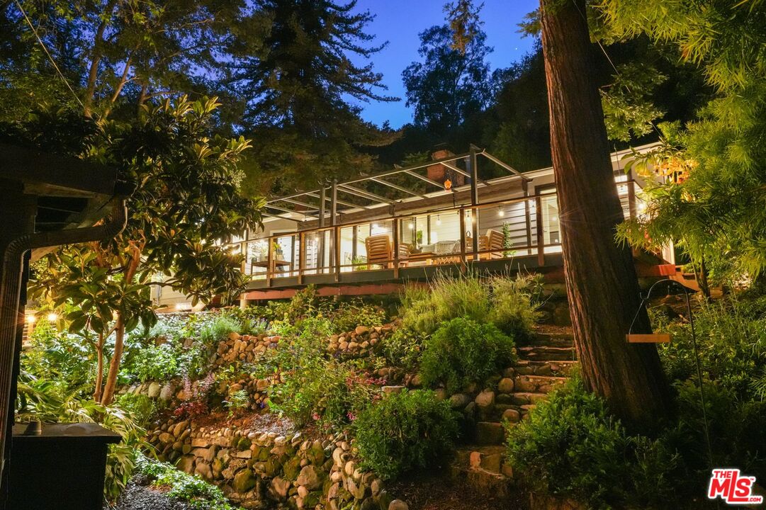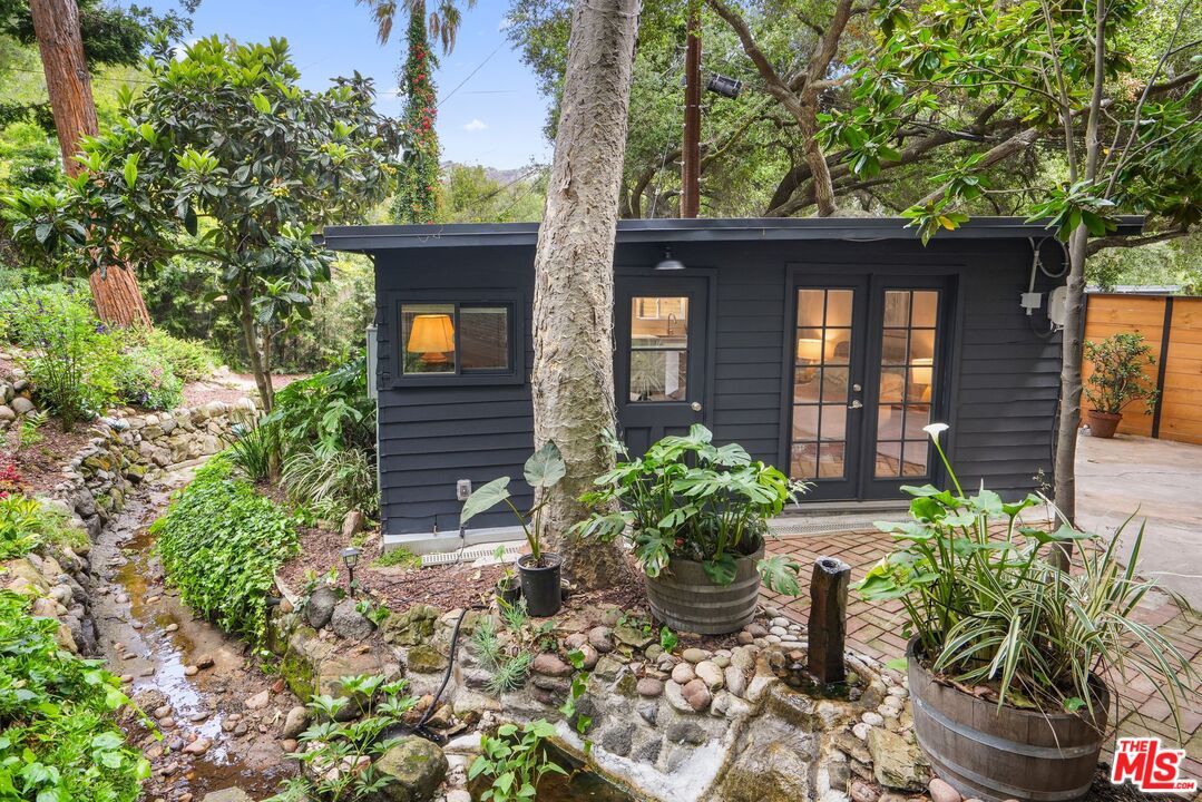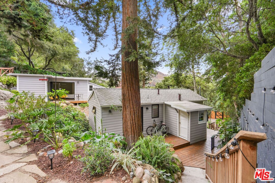 Into the Woods. Behind gates lies a captivating view home and guest house, nestled in a forest dell, in a serene and picturesque setting next to a tiny creek. Under towering Redwoods, in breezy Lower Fernwood, find tranquility amid modern living. Completely updated, with luxury finishes throughout, this 1940s woodland home has been stylishly remodeled to meet the needs of both a modern life, and the soul soothing comforts of a timeless home in the mountains. Completely updated, with luxury finishes throughout, this 1940s woodland home has been stylishly remodeled to meet the needs of both a modern life, and the soul soothing comforts of a timeless home in the mountains. Step through the foyer into an open, large airy, kitchen with a cheery fireplace, and a glass accordion wall open to the spacious creekside deck. A wide island faces the view, and sleek appliances, including a wine refrigerator, let the chef in you come out to play. Sink into the cozy tv nook nearby, with a comforting wood stove to keep things warm. A loft styled living room sits beyond, with another wall of glass, gazing out past the deck to stately Redwoods, and the mountain peaks beyond. On the main level, a library or third bedroom sits in dappled sunlight. An elegantly remodeled bath sits near a bedroom, with glass doors out to its own private deck. Up the open staircase of the lofty living room, a spacious primary suite with 2 walk in closets and views of distant hills, sits on it's own level. The bathroom matches the beauty of its surroundings. Step out of the glass doors onto another private deck with views of the mountains, the gardens, and the fruit trees. A path leads to a studio, perfect as creative space, or a great workshop. Old stone steps meander past fragrantly blooming citrus trees, to a crows nest of an upper deck. Here you can watch the sun rise and set or just gaze upon the lush, private outdoor grounds. A spacious guest house, with its own yard and deck, a bathroom, and kitchenette, welcomes your family and friends. The wide main deck hosts gatherings or solitude. Whether you're sipping your morning coffee on, or unwinding in the evening, the natural surroundings provide a magical backdrop for any occasion. Situated in the tranquil community of Topanga, this home is a true sanctuary, offering a perfect blend of privacy and convenience. The coast is just a short drive away. Lower Topanga state park is just steps away. The charming shops, cafes, and boutiques of Topanga are close by. Here in the forest, your fairy tale begins.