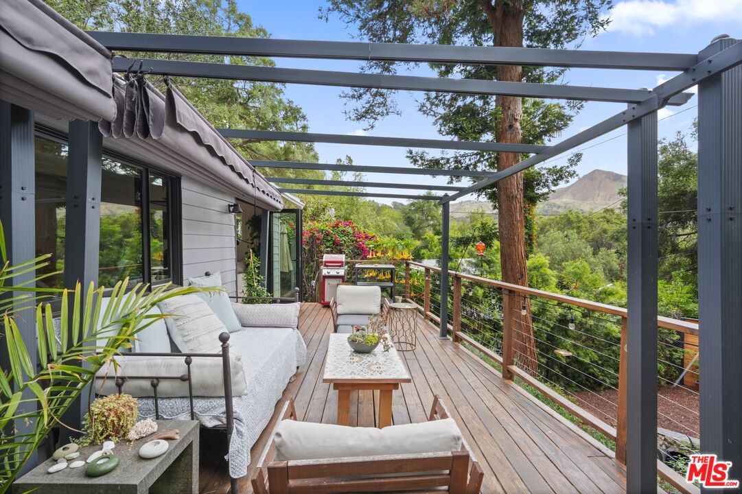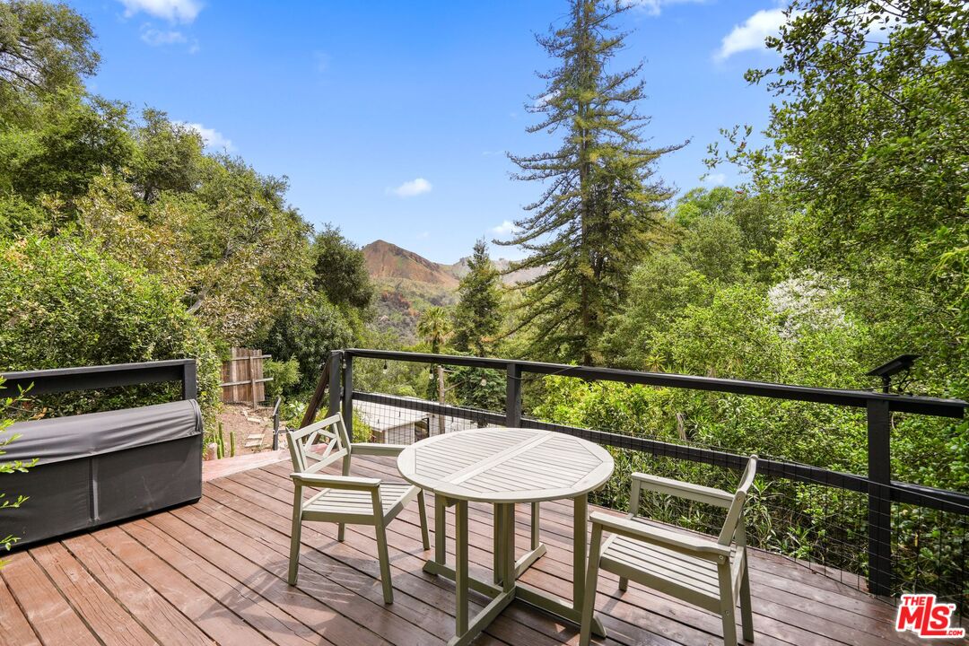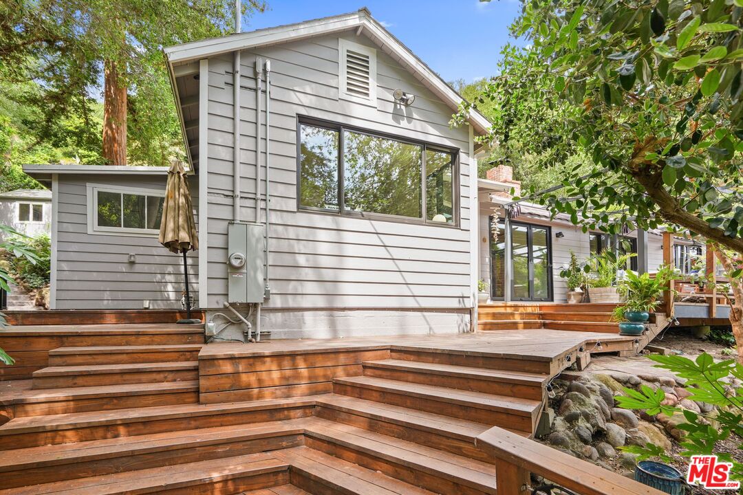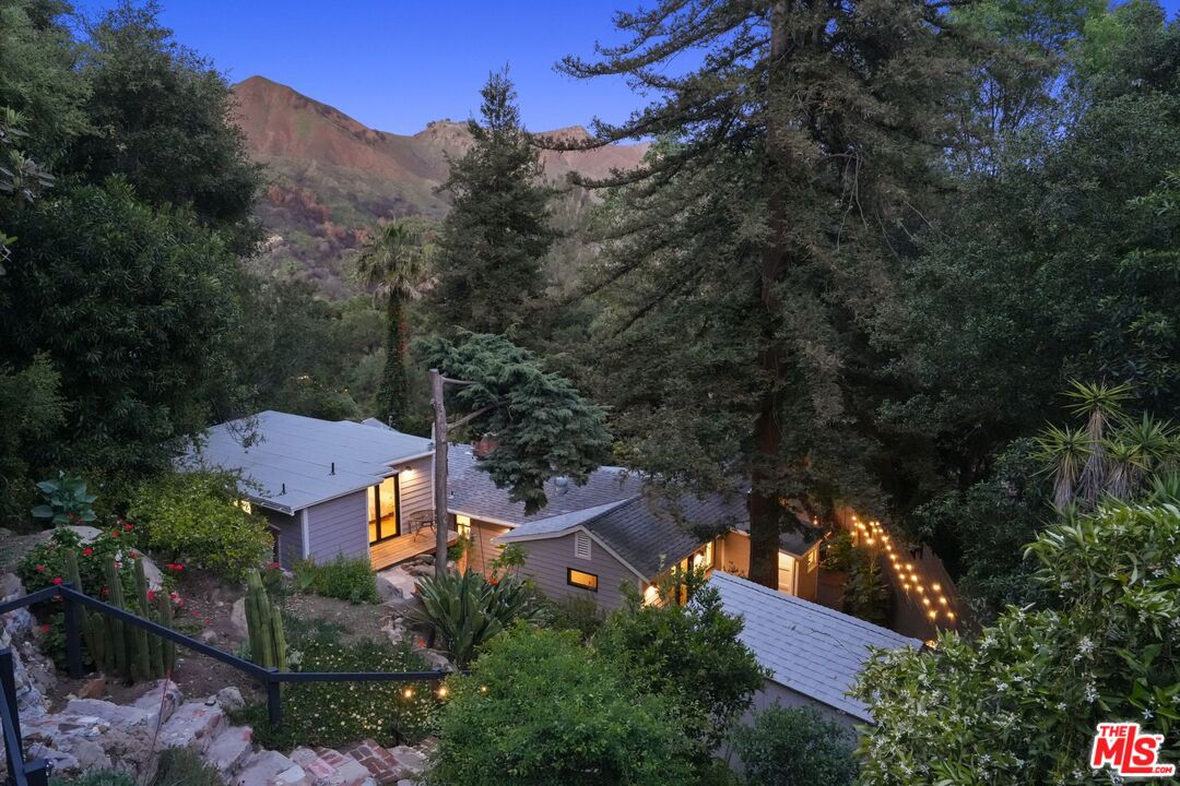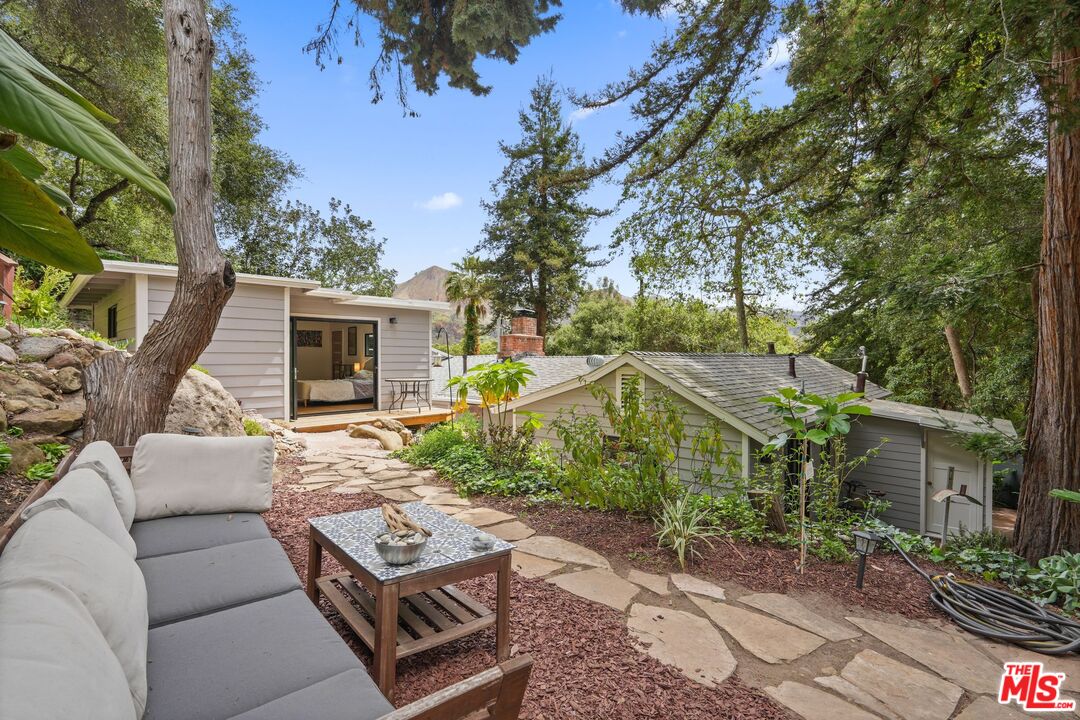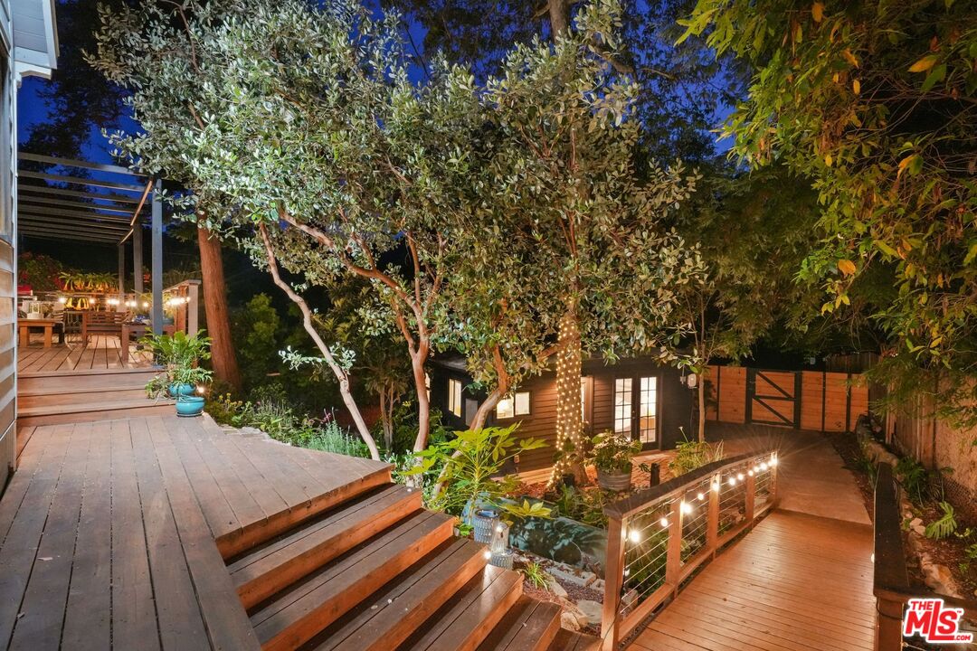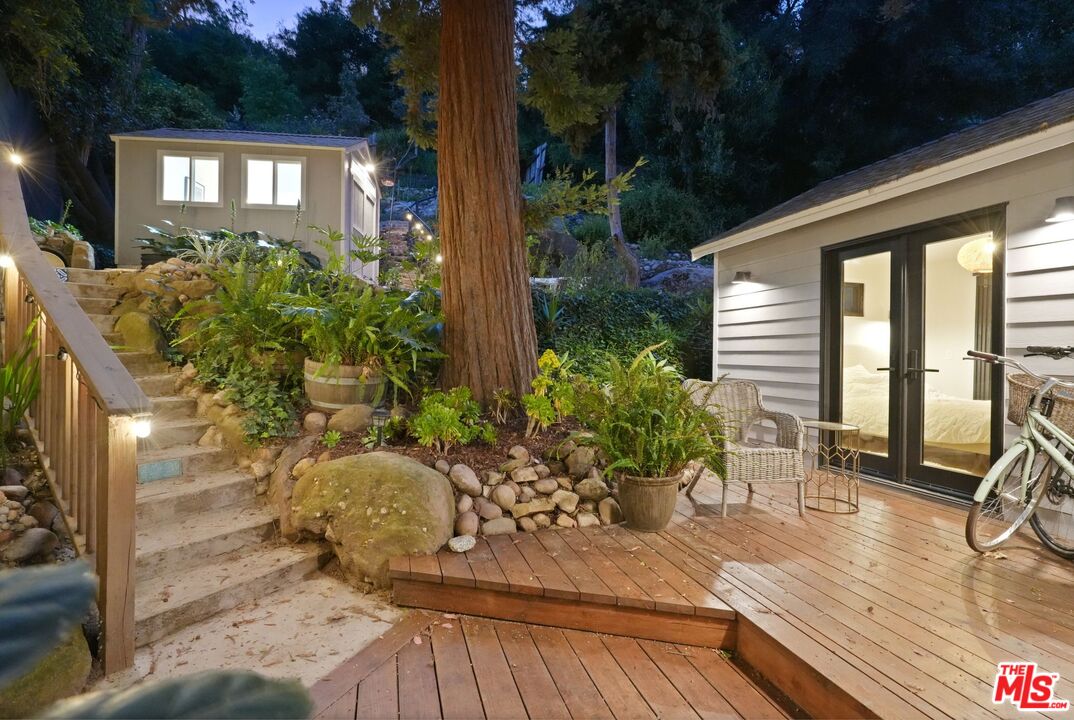 Into the Woods. Behind gates lies a captivating view home and guest house, nestled in a forest dell, in a serene and picturesque setting next to a tiny creek. Under towering Redwoods, in breezy Lower Fernwood, find tranquility amid modern living. Completely updated, with luxury finishes throughout, this 1940s woodland home has been stylishly remodeled to meet the needs of both a modern life, and the soul soothing comforts of a timeless home in the mountains. Completely updated, with luxury finishes throughout, this 1940s woodland home has been stylishly remodeled to meet the needs of both a modern life, and the soul soothing comforts of a timeless home in the mountains. Step through the foyer into an open, large airy, kitchen with a cheery fireplace, and a glass accordion wall open to the spacious creekside deck. A wide island faces the view, and sleek appliances, including a wine refrigerator, let the chef in you come out to play. Sink into the cozy tv nook nearby, with a comforting wood stove to keep things warm. A loft styled living room sits beyond, with another wall of glass, gazing out past the deck to stately Redwoods, and the mountain peaks beyond. On the main level, a library or third bedroom sits in dappled sunlight. An elegantly remodeled bath sits near a bedroom, with glass doors out to its own private deck. Up the open staircase of the lofty living room, a spacious primary suite with 2 walk in closets and views of distant hills, sits on it's own level. The bathroom matches the beauty of its surroundings. Step out of the glass doors onto another private deck with views of the mountains, the gardens, and the fruit trees. A path leads to a studio, perfect as creative space, or a great workshop. Old stone steps meander past fragrantly blooming citrus trees, to a crows nest of an upper deck. Here you can watch the sun rise and set or just gaze upon the lush, private outdoor grounds. A spacious guest house, with its own yard and deck, a bathroom, and kitchenette, welcomes your family and friends. The wide main deck hosts gatherings or solitude. Whether you're sipping your morning coffee on, or unwinding in the evening, the natural surroundings provide a magical backdrop for any occasion. Situated in the tranquil community of Topanga, this home is a true sanctuary, offering a perfect blend of privacy and convenience. The coast is just a short drive away. Lower Topanga state park is just steps away. The charming shops, cafes, and boutiques of Topanga are close by. Here in the forest, your fairy tale begins.