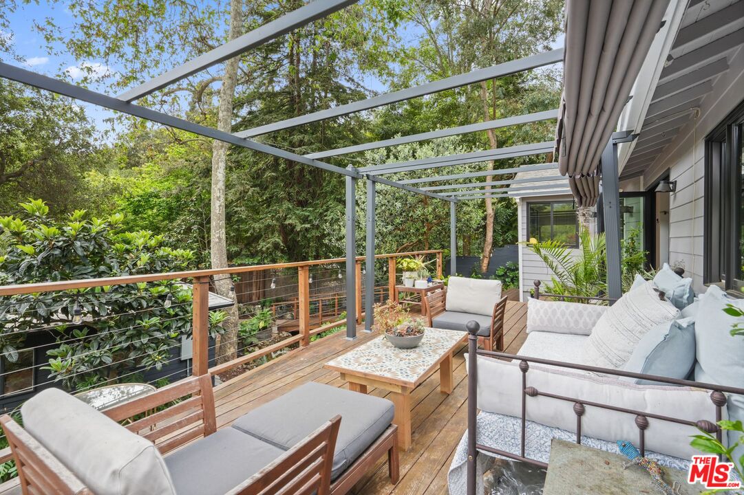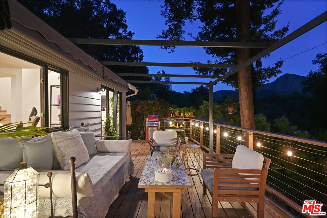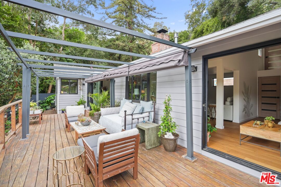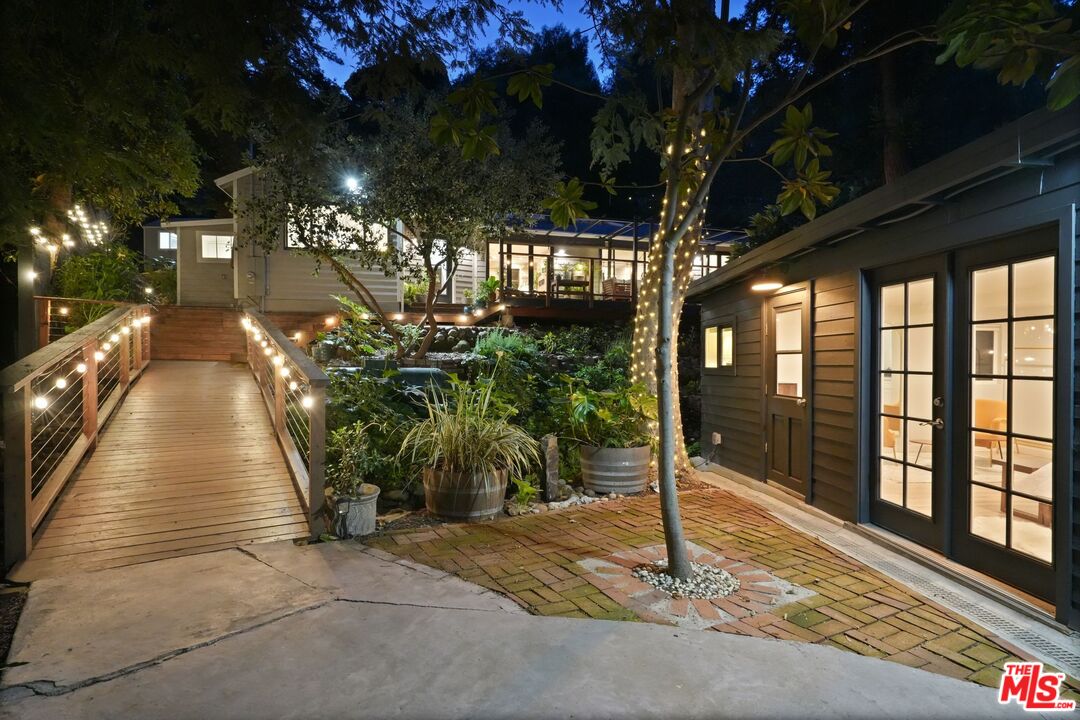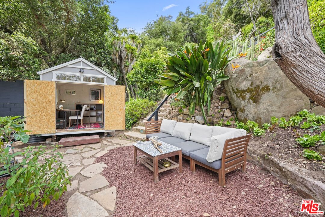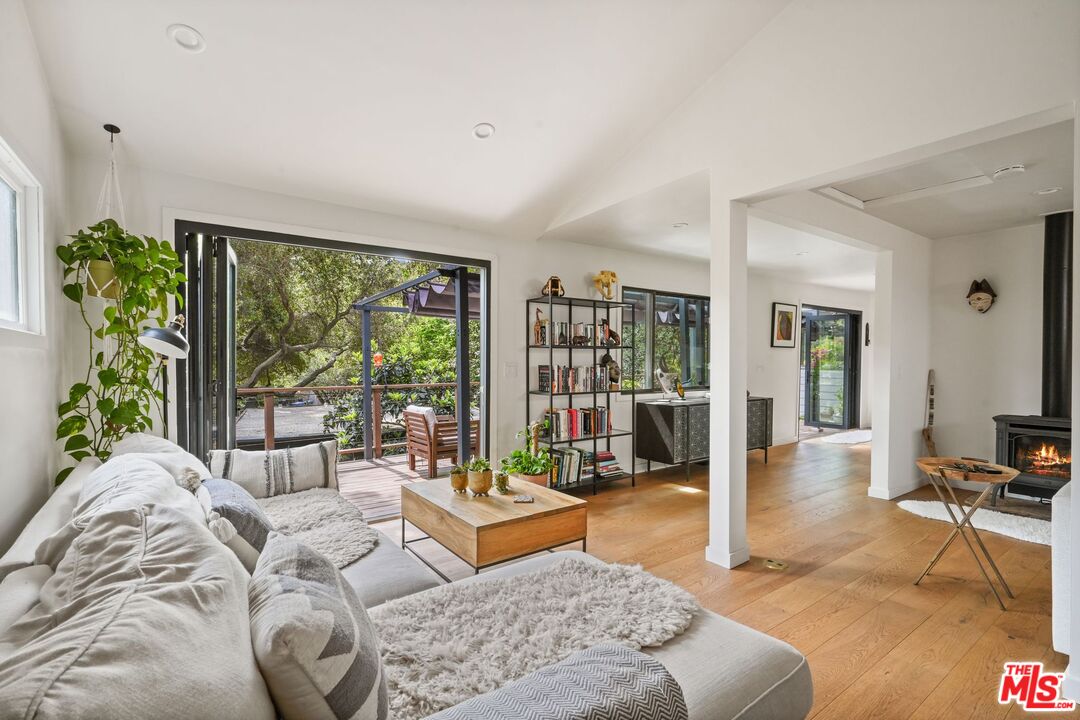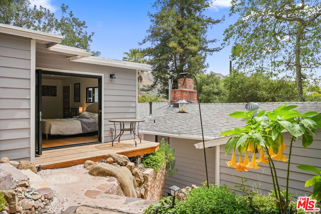 Into the Woods. Behind gates lies a captivating view home and guest house, nestled in a forest dell, in a serene and picturesque setting next to a tiny creek. Under towering Redwoods, in breezy Lower Fernwood, find tranquility amid modern living. Completely updated, with luxury finishes throughout, this 1940s woodland home has been stylishly remodeled to meet the needs of both a modern life, and the soul soothing comforts of a timeless home in the mountains. Completely updated, with luxury finishes throughout, this 1940s woodland home has been stylishly remodeled to meet the needs of both a modern life, and the soul soothing comforts of a timeless home in the mountains. Step through the foyer into an open, large airy, kitchen with a cheery fireplace, and a glass accordion wall open to the spacious creekside deck. A wide island faces the view, and sleek appliances, including a wine refrigerator, let the chef in you come out to play. Sink into the cozy tv nook nearby, with a comforting wood stove to keep things warm. A loft styled living room sits beyond, with another wall of glass, gazing out past the deck to stately Redwoods, and the mountain peaks beyond. On the main level, a library or third bedroom sits in dappled sunlight. An elegantly remodeled bath sits near a bedroom, with glass doors out to its own private deck. Up the open staircase of the lofty living room, a spacious primary suite with 2 walk in closets and views of distant hills, sits on it's own level. The bathroom matches the beauty of its surroundings. Step out of the glass doors onto another private deck with views of the mountains, the gardens, and the fruit trees. A path leads to a studio, perfect as creative space, or a great workshop. Old stone steps meander past fragrantly blooming citrus trees, to a crows nest of an upper deck. Here you can watch the sun rise and set or just gaze upon the lush, private outdoor grounds. A spacious guest house, with its own yard and deck, a bathroom, and kitchenette, welcomes your family and friends. The wide main deck hosts gatherings or solitude. Whether you're sipping your morning coffee on, or unwinding in the evening, the natural surroundings provide a magical backdrop for any occasion. Situated in the tranquil community of Topanga, this home is a true sanctuary, offering a perfect blend of privacy and convenience. The coast is just a short drive away. Lower Topanga state park is just steps away. The charming shops, cafes, and boutiques of Topanga are close by. Here in the forest, your fairy tale begins.