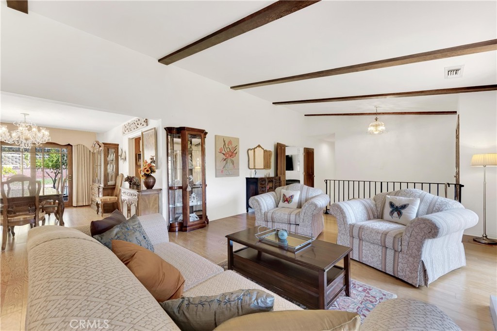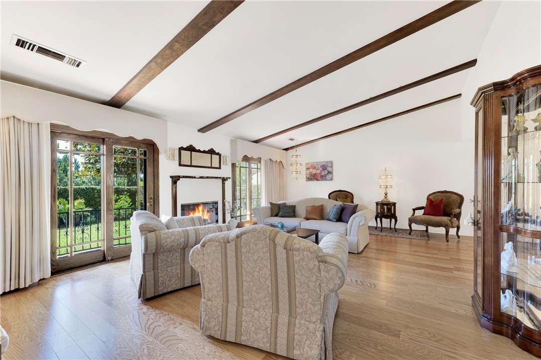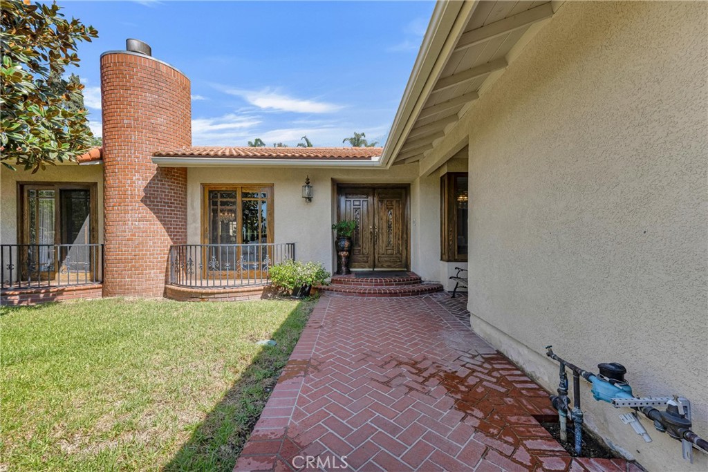 Spacious, ranch-style, 5 bed, 2.5 bath, 2,601 sq ft home, set on a sprawling 17,516 sq ft lot in desirable Chatsworth neighborhood. The home blends comfort, style, and aesthetic touches like high ceilings with decorative beams, whole house fan, solar tubes, central vacuum, Queen Ann style sliding doors, and so much more! Roof is less than 5 years old! AC is less than 2 years old! Great curb appeal with green lawn, herringbone brick ribbons and walkway, and a private, gated, front courtyard, creating a warm and welcoming first impression. Double doors open to a tiled entry where sightlines draw you straight through to the backyard, instantly showcasing the home’s seamless indoor-outdoor flow. A step-down formal living room impresses with soaring, cathedral ceilings, wood floors, and striking fireplace flanked by sliding doors that lead to Juliette balconies overlooking the front courtyard. The elegant, adjoining dining room, accented by a bay window and slider, transitions into the kitchen. Truly a chef’s dream, featuring charming garden window, granite counters, rich wood cabinetry, wine storage, double ovens, and a convenient central island with breakfast bar, and a charming garden window. Perfect for entertaining or gathering, the kitchen opens to an informal family room enhanced by a slider that floods the space with natural light. All bedrooms are thoughtfully positioned down the hall, including four good sized bedrooms which share a full, hall bath. The spacious primary suite is a retreat unto itself, with dual closets, including a walk-in, glass slider out to the backyard, and a remodeled en-suite ¾ bath with quartz counters and walk-in, tiled shower with multi-head, and direct access to a private atrium retreat. Step outside to your own oasis where a covered patio with skylight and ceiling fans, a sparkling pebble-tech pool, green lawn, and mature landscaping create the ultimate setting for BBQs, parties, or quiet relaxation. An oversized 3-car garage with ex