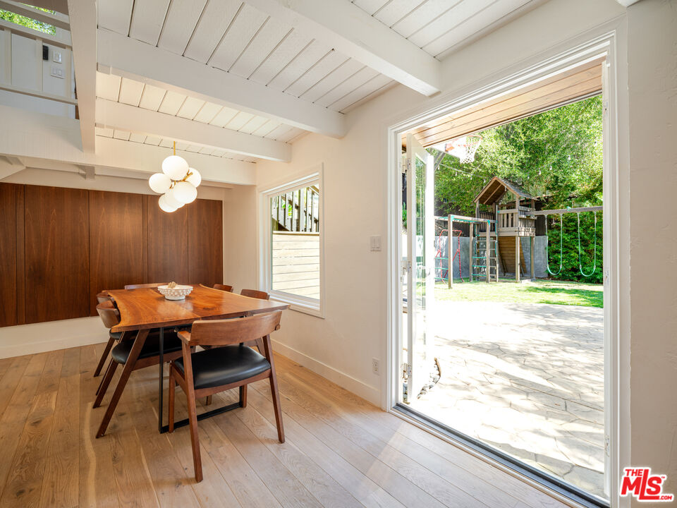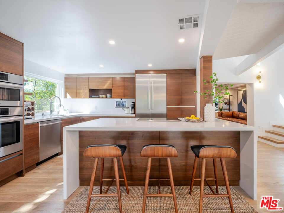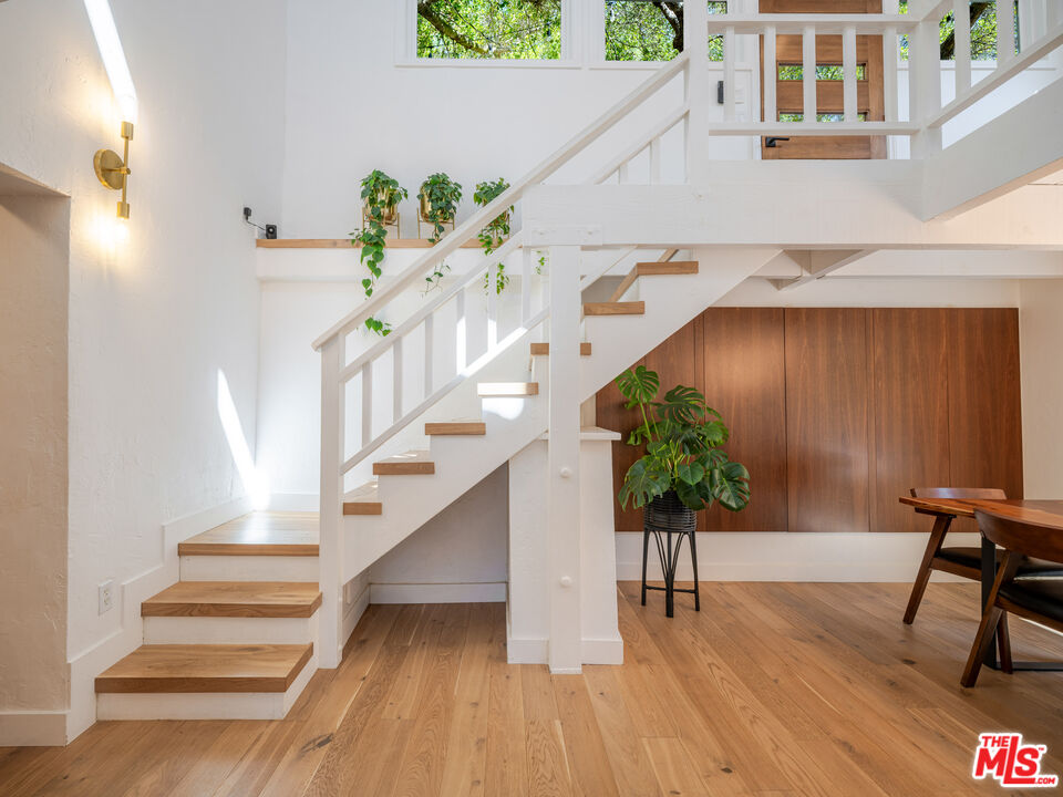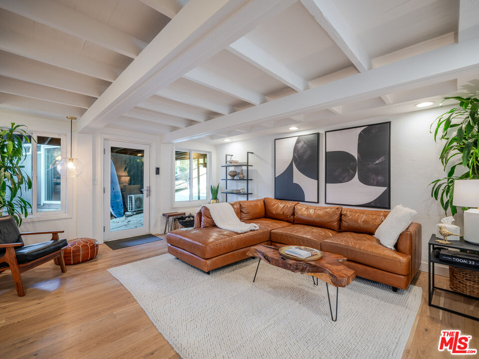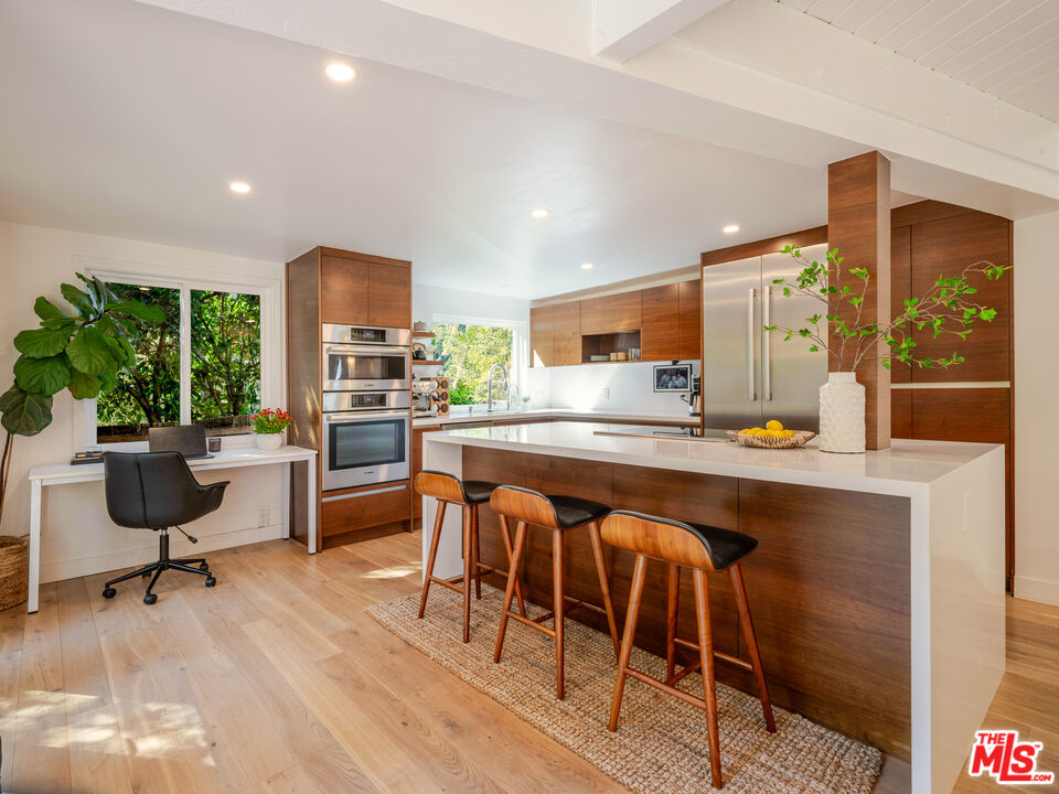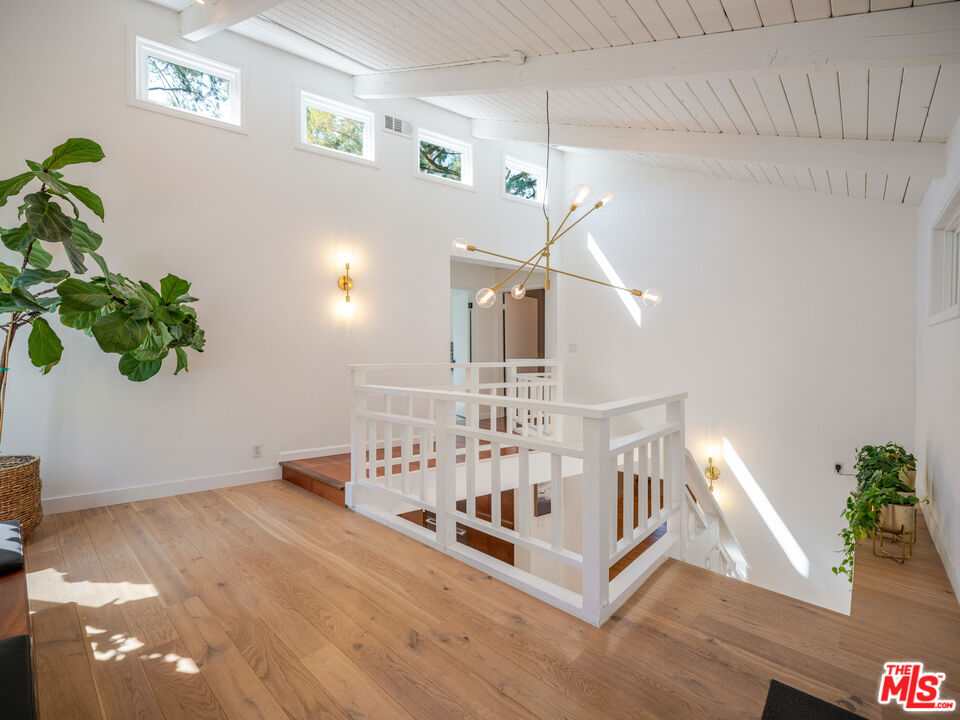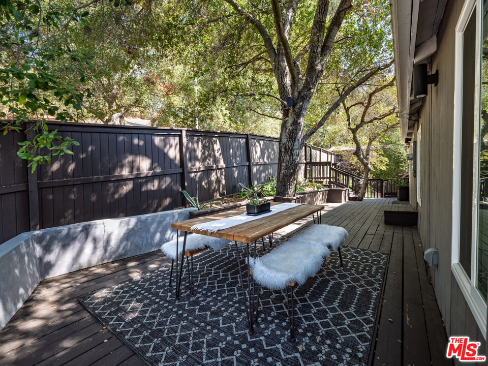 Welcome to the ultimate Topanga retreat, where modern upgrades meet timeless canyon charm. Nestled on a quiet, hidden street off Topanga Canyon Blvd, this treasure offers the perfect balance of privacy, style, and connection to nature. Inside, an open entry concept features soaring vaulted ceilings extending both levels and a modern chandelier welcoming bright natural light. Upstairs, the space leads to two bedrooms, and a crisp, updated bathroom with a classic clawfoot tub. The spacious primary suite features a comfortable additional space to relax or work, and opens to its own private deck, the perfect spot to enjoy your morning coffee while taking in tree-lined canyon views. The large deck wraps around for great outdoor entertaining under delightful string lighting. The main floor effortlessly blends contemporary design with Topanga character. The recently remodeled kitchen boasts continuous-grain walnut cabinetry, white quartz countertops, high-end built-in appliances, and a generous island with waterfall, ideal for cooking and entertaining. Large double doors open to a beautifully landscaped fully-fenced flat backyard, inviting a harmonious indoor-outdoor flow. The dining area is framed by walnut finishes perfect for gatherings, while the cozy living room invites movie or game nights. A third bedroom with a remodeled en-suite bathroom adds comfort and flexibility. The extensive list of upgrades includes beautiful oak wood flooring, new windows and doors throughout, and a whole-house water filtration system. Step through the living room to discover a bonus studio/gym and direct access to the driveway, complete with automatic gate and EV charger. In the vicinity you'll find central access to the best of the westside and the valley communities. Featuring scenic drives to nearby beaches, Santa Monica, Malibu and Calabasas. Enjoy local gems including the Topanga Community Center, playground and ballfield, weekly farmers market, Food Truck Fridays, and charming coffee shops and cafes, combining peaceful canyon living with vibrant neighborhood amenities.