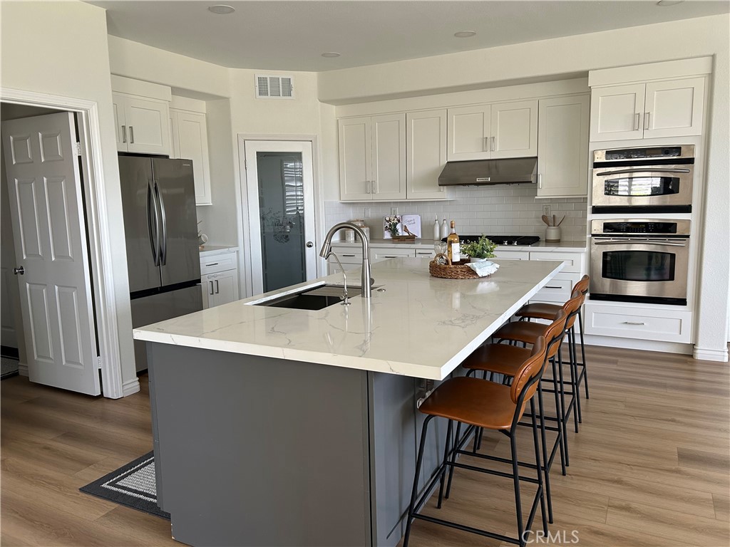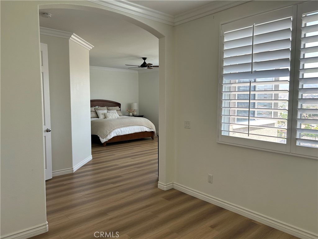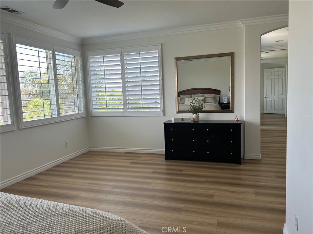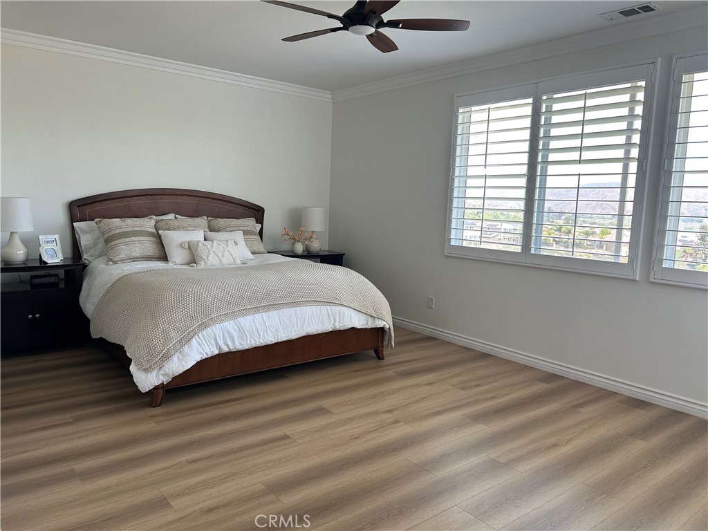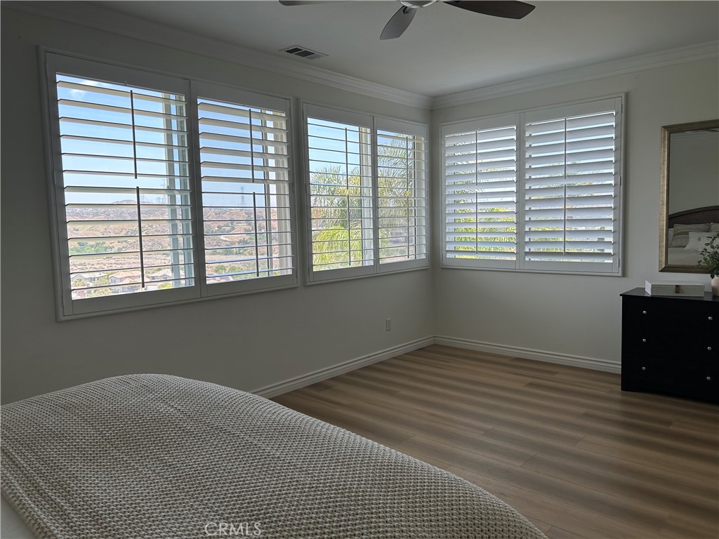 Welcome to your dream home! Nestled in a serene cul-de-sac comprised of just nine beautiful residences, this magnificent 4-bedroom plus primary retreat, 3.5-bathroom house offers an exceptional blend of comfort, luxury, and convenience with show stopping views throughout the home! This home is thoughtfully designed for modern living, featuring a full bedroom with an ensuite bathroom conveniently located on the lower level—ideal for long-term guests or a multigenerational family setup. Upstairs, the primary suite is a true sanctuary, boasting incredible views, a private retreat that could double as a yoga or workout space with its stunning floor-to-ceiling mirrored wall, and a recently renovated spa-like bathroom with a walk-in closet. The heart of the home is the recently renovated kitchen, a chef’s delight! It features a sprawling kitchen island, luxurious quartz countertops, updated cabinetry, and top-of-the-line stainless steel appliances. Enjoy preparing meals with ease using the double-oven and take advantage of the convenient walk-in pantry. The breakfast bar is perfect for casual dining, while recessed lighting creates an inviting atmosphere for entertaining friends and family. This home seamlessly blends form and function, boasting separate living and family rooms, along with a formal dining area that’s perfect for hosting dinner parties. The consistent tasteful laminate flooring throughout adds warmth and style, complemented by tile flooring in the bathrooms for easy maintenance. Every detail has been carefully considered, from the white shutters and mirrored wardrobes to the ceiling fans that enhance airflow and comfort. Abundant natural light fills each room, creating a welcoming and cheerful environment. Step outside to enjoy a perfectly manicured, serene yard and breathtaking views, or take a short stroll to the community’s impressive amenities. The peaceful lake with a pathway, two sparkling pools, a spa, Clubhouse, barbecue area, gym, and a variety of