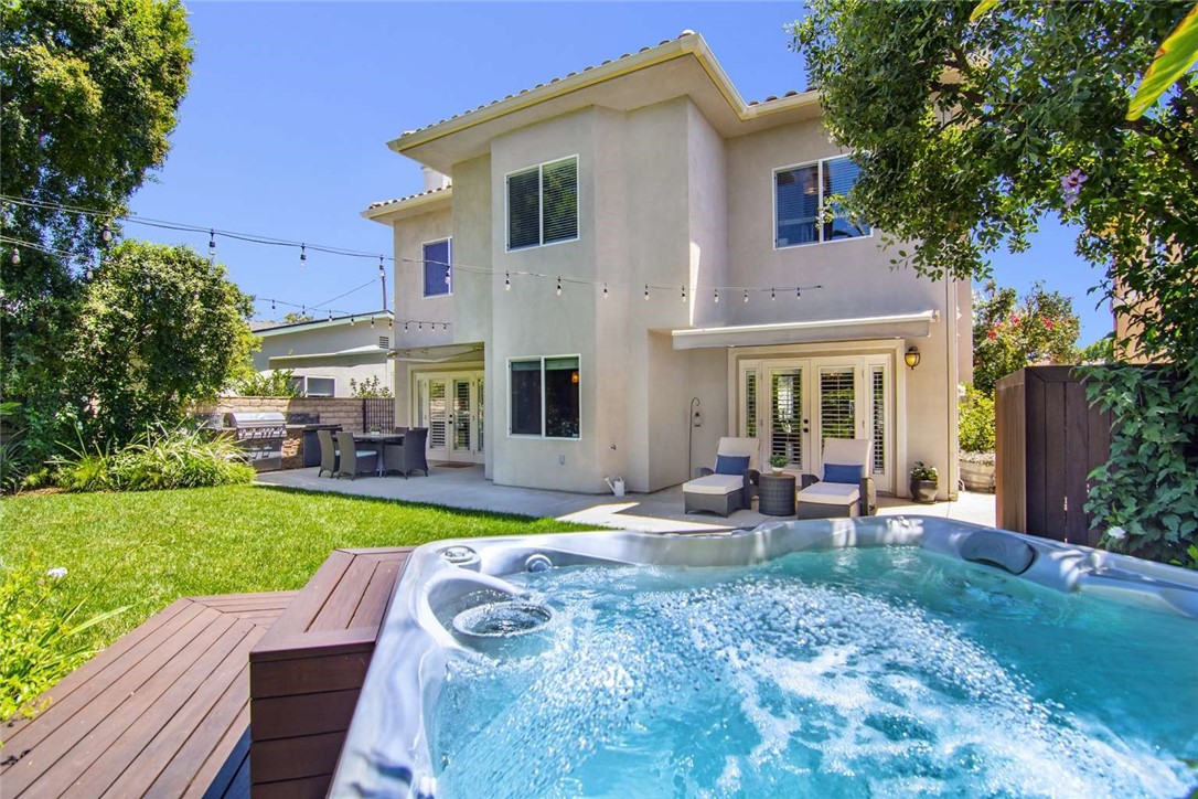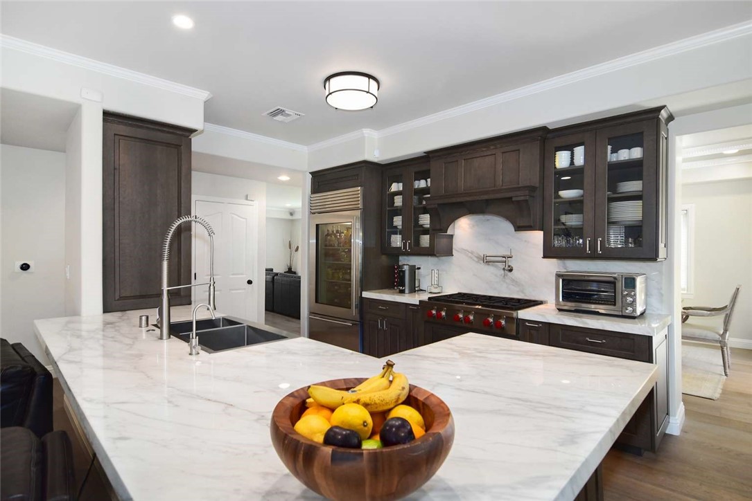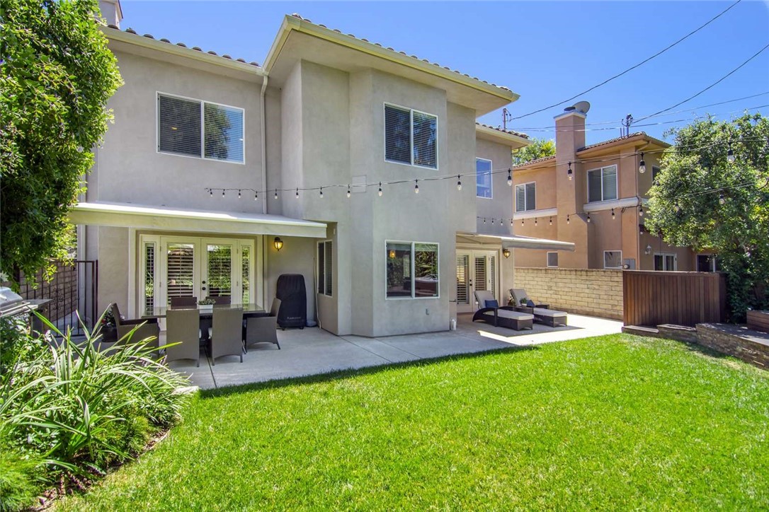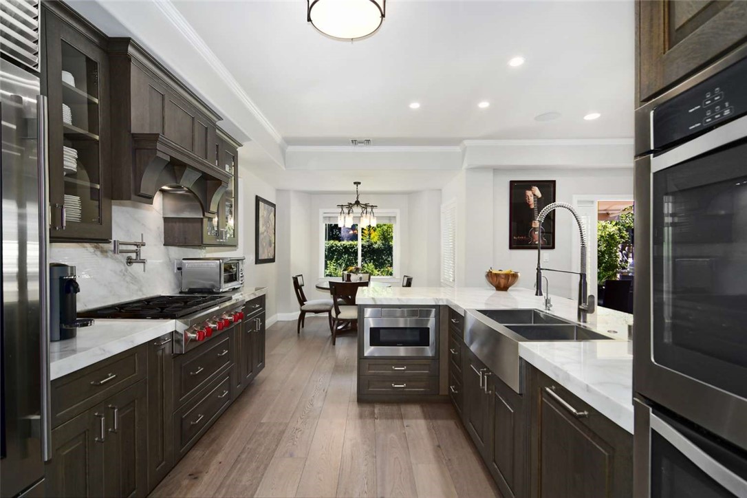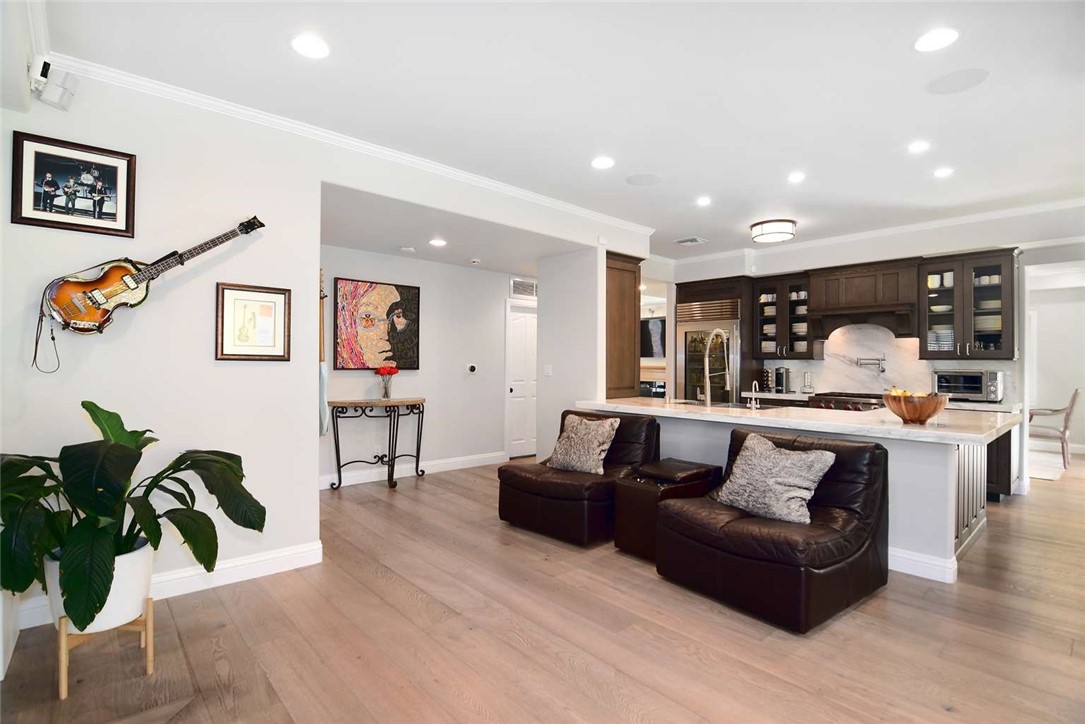 This stunning two-story gated home combines style, functionality and security, with stacked stone accents and meticulously manicured landscaping. Located in the Encino flats area where newly constructed homes are selling at $3.5mil and more, this home offers comfortable convenient luxury living, while enjoying continued appreciation. Minutes to the Westside, and blocks from Ventura Boulevard, offering endless dining, shopping, medical and business services. Inside this home, French oak floors grace the entire first level, with a spacious living room with gas fireplace, formal dining room with a coffered ceiling, built-in cabinetry, a dry bar with wine fridge, and crystal chandelier. Two sets of dual French doors make indoor-outdoor entertaining flow. Fully remodeled chef’s kitchen includes custom cabinetry, Carrara marble seamless countertops, Sub-Zero glass-front fridge, Wolf six-burner range with pot filler, double ovens, built-in microwave, walk-in pantry, and a breakfast nook, all open to the adjacent den with second fireplace and French doors to the outdoor BBQ with covered dining area. Upstairs are four spacious bedrooms, three full baths, and laundry. The luxurious primary suite boasts dual custom walk-in closets, a generous travertine full bath with large jetted tub, separate shower, and dual vanities. The beautifully landscaped backyard features two patios with retractable awnings, a lush grassy area, a built-in hot tub, a custom BBQ station, and charming string lighting—perfect for outdoor entertaining. Additional highlights include a finished garage with an epoxy floor and built-in cabinetry. This smart home is also equipped with Ring security cameras; a water-saving automated irrigation system; a tankless water heater for endless hot water, dual-zone HVAC with energy-efficient Nest thermostats; mobile-app controlled outdoor lighting, garage door and front door; and a premium Bose surround sound system.