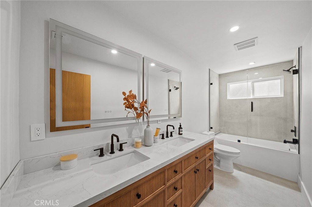 Luxurious reimagined single level home finished with top-tier quality and unique design elements, situated within the coveted Hesby Oaks school district surrounded by multi-million dollar homes. The expansive floor-plan offers 4 bedrooms and 3.5 bathrooms and the home is flooded with tons of natural light. A gourmet Chef's kitchen displaying porcelain countertops and a large center island with breakfast seating flows into the impressive wine display. The luxurious master suite offers a large walk-in closet and spa-like bathroom with double vanity space and walk-in shower. Private yard with ample grassy area, patio dining seating and built-in BBQ area. Additional amenities include surround sound throughout, security cameras, and easy access just minutes from Ventura Blvd and Encino's best schools, shops and restaurants.