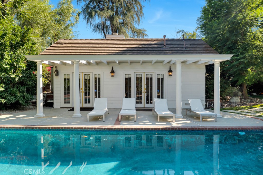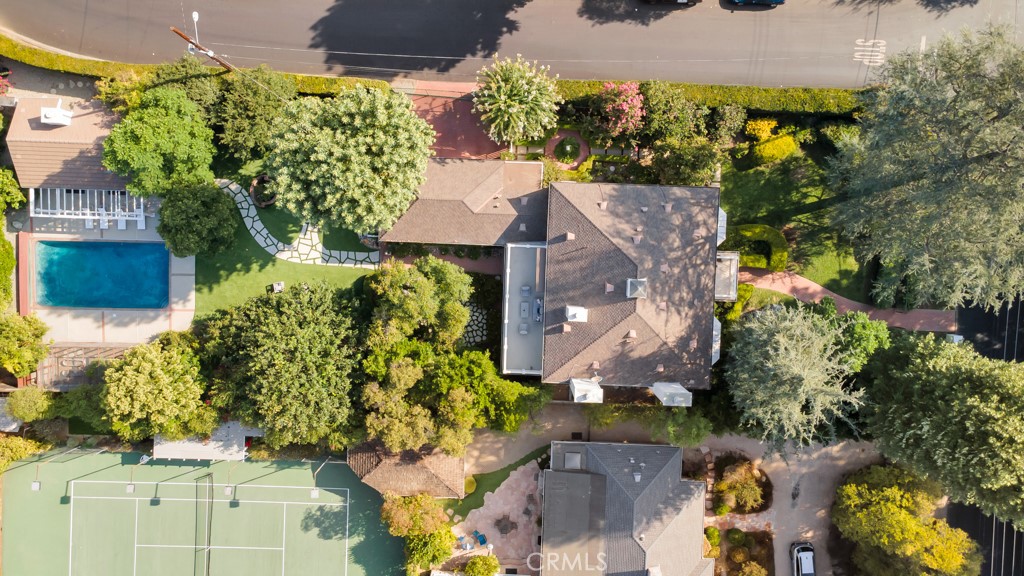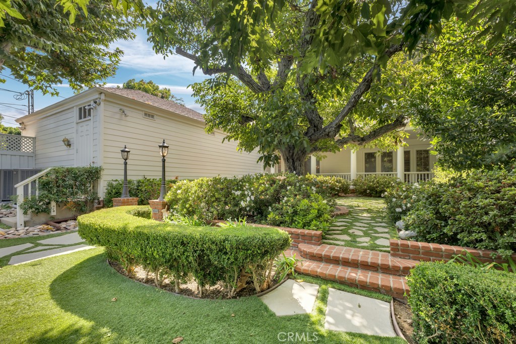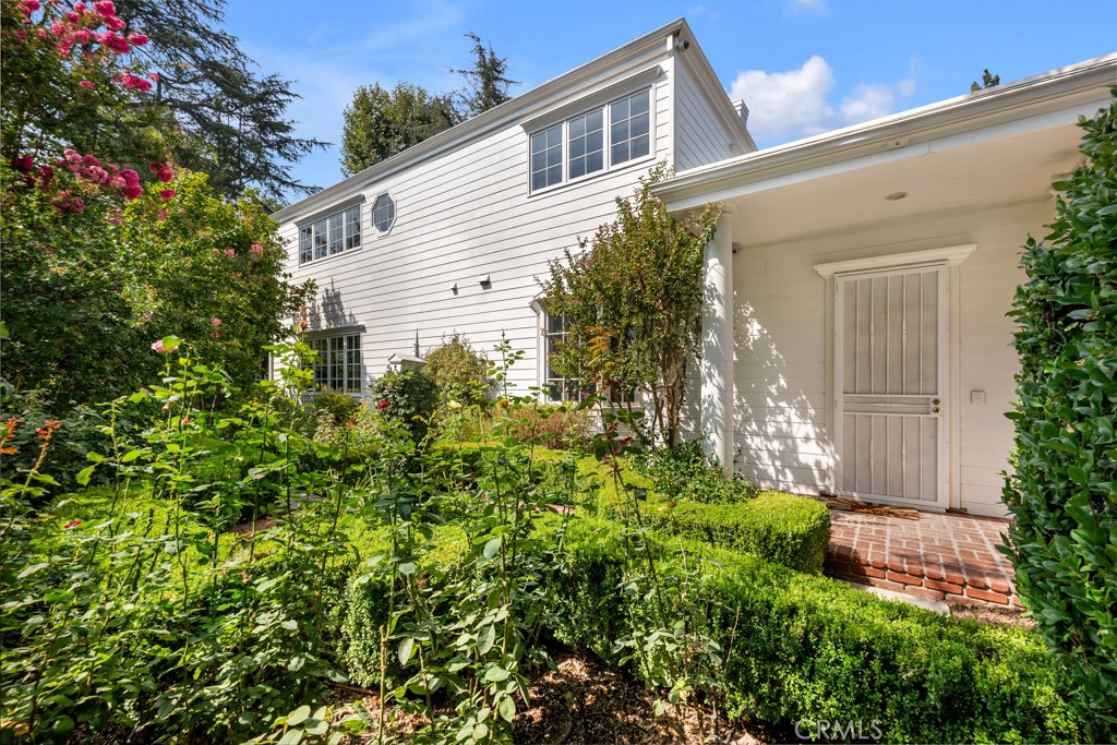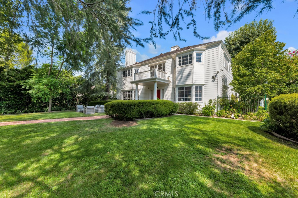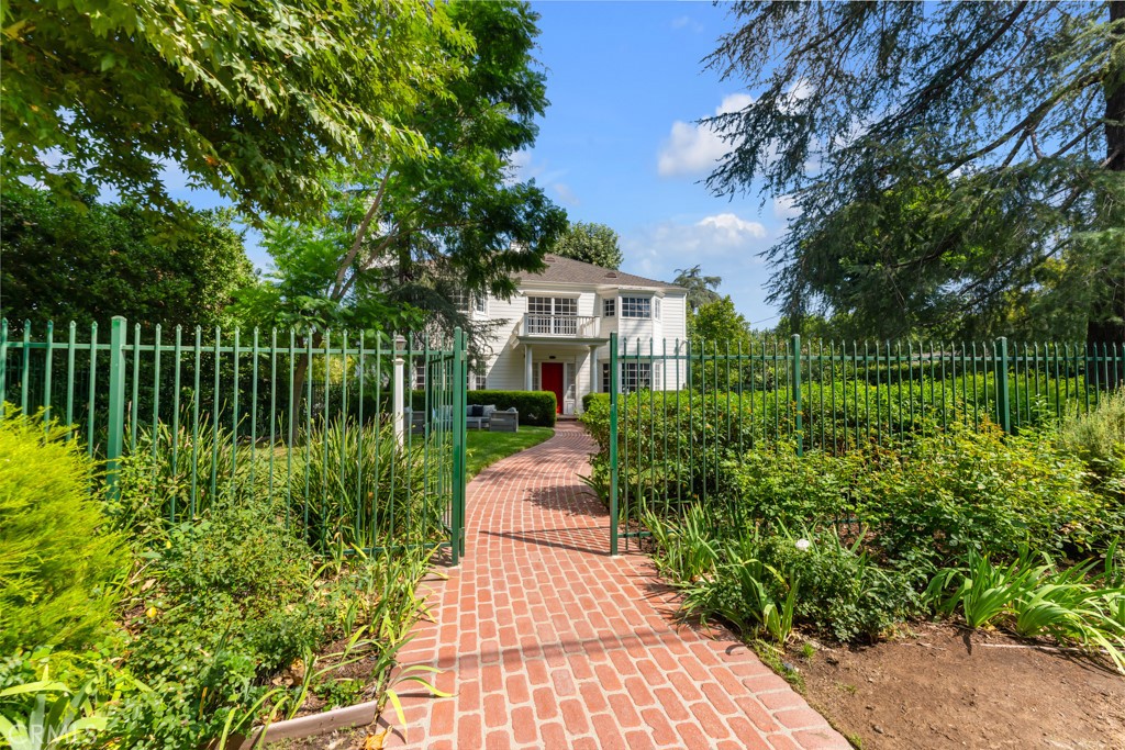 Tucked behind private gates in one of the most coveted South of the Boulevard neighborhoods, this stately Georgian estate sits on a rare, flat 18,546 sq. ft. lot surrounded by lush greenery and mature trees. Built in 1997 with timeless design and soaring 10-foot ceilings, this home offers both sophistication and warmth, blending classic elegance with everyday comfort. From the moment you enter the grand foyer, you’re welcomed into a home designed for entertaining and gathering. The formal living and dining rooms set the stage for memorable celebrations, while the spacious family room with its French doors leading to the gorgeous covered patio invite more casual moments. Overlooking a blooming rose garden, the kitchen features a center island, walk-through butler’s pantry, and abundant storage—making it the heart of the home. Upstairs, the primary suite is a private retreat, complete with French doors that open to an expansive balcony with sweeping views of the lush grounds. The spa-like bathroom offers a soaking tub, dual vanities, and a separate shower, while double walk-in closets provide ample space. A handsome library with built-ins and balcony access creates the perfect escape, and two additional en-suite bedrooms ensure comfort for all. The outdoors feel like a private sanctuary. A sparkling pool with automatic cover is ideal for long summer days, while the expansive grounds include an enclosed vegetable garden with raised beds and an orchard of fruit trees—apple, avocado, pomegranate, citrus, and walnut to name a few—bringing both beauty and bounty. A charming 400 sq. ft. GUEST HOUSE with its own kitchen, bath, and French doors offers the perfect space for visitors, home office or creative pursuits. Minutes from Ventura Blvd. with shops and entertainment, El Caballero and Braemar Country clubs and easy access to 101 freeway. With its rare combination of space, privacy, and timeless style, this estate is more than a home—it’s a lifestyle.